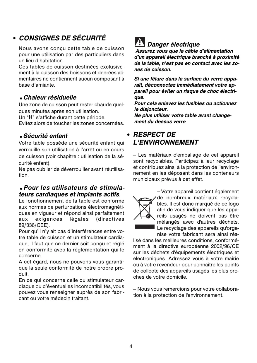 - Pour les utilisateurs de stimulateurs cardiaques et implants actifs. — Votre appareil contient également de nombreux matériaux recyclables. Il est donc marqué de ce logo afin de vous indiquer que les appareils usagés ne doivent pas être mélangés avec d'autres déchets. Le recyclage des appareils qu'organise votre fabricant sera ainsi réalisé dans les meilleures conditions, conformément à la directive européenne 2002/96/CE sur les déchets d'équipements électriques et électroniques. Adressez vous à votre mairie ou à votre revendeur pour connaître les points de collecte des appareils usagés les plus proches de votre domicile. Le fonctionnement de la table est conforme aux normes de perturbations électromagnétiques en vigueur et répond ainsi parfaitement aux exigences légales (directives 89/336/CEE). Pour qu’il n’y ait pas d’interférences entre votre table de cuisson et un stimulateur cardiaque, il faut que ce dernier soit conçu et réglé en conformité avec la réglementation qui le concerne. A cet égard, nous ne pouvons vous garantir que la seule conformité de notre propre produit. En ce qui concerne celle du stimulateur cardiaque ou d’éventuelles incompatibilités, vous pouvez vous renseigner auprès de son fabricant ou votre médecin traitant. — Nous vous remercions pour votre collaboration à la protection de l'environnement.
