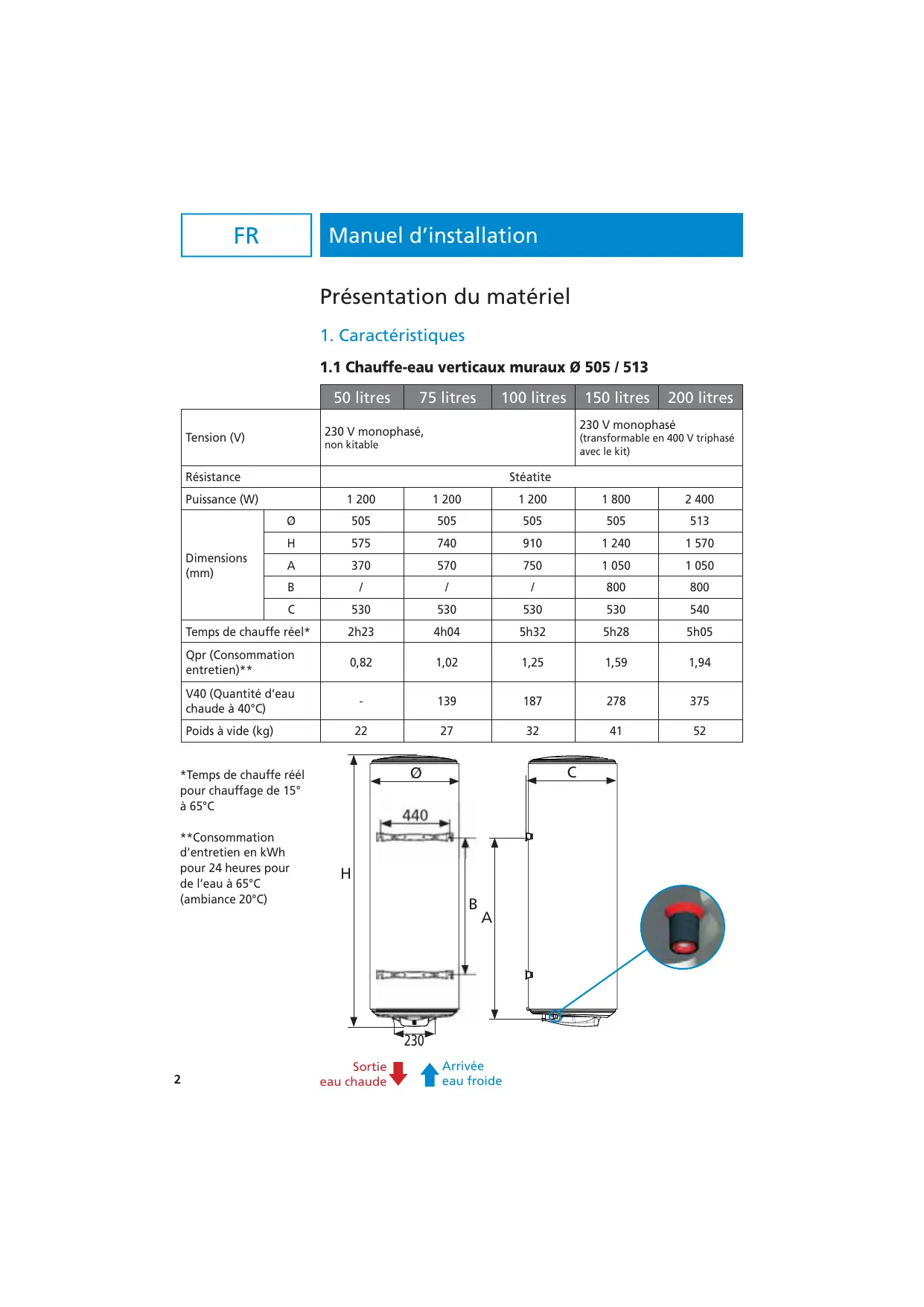 200 litres 230 V monophasé 230 V monophasé, Tension (V) Dimensions (mm) 150 litres Arrivée eau froide