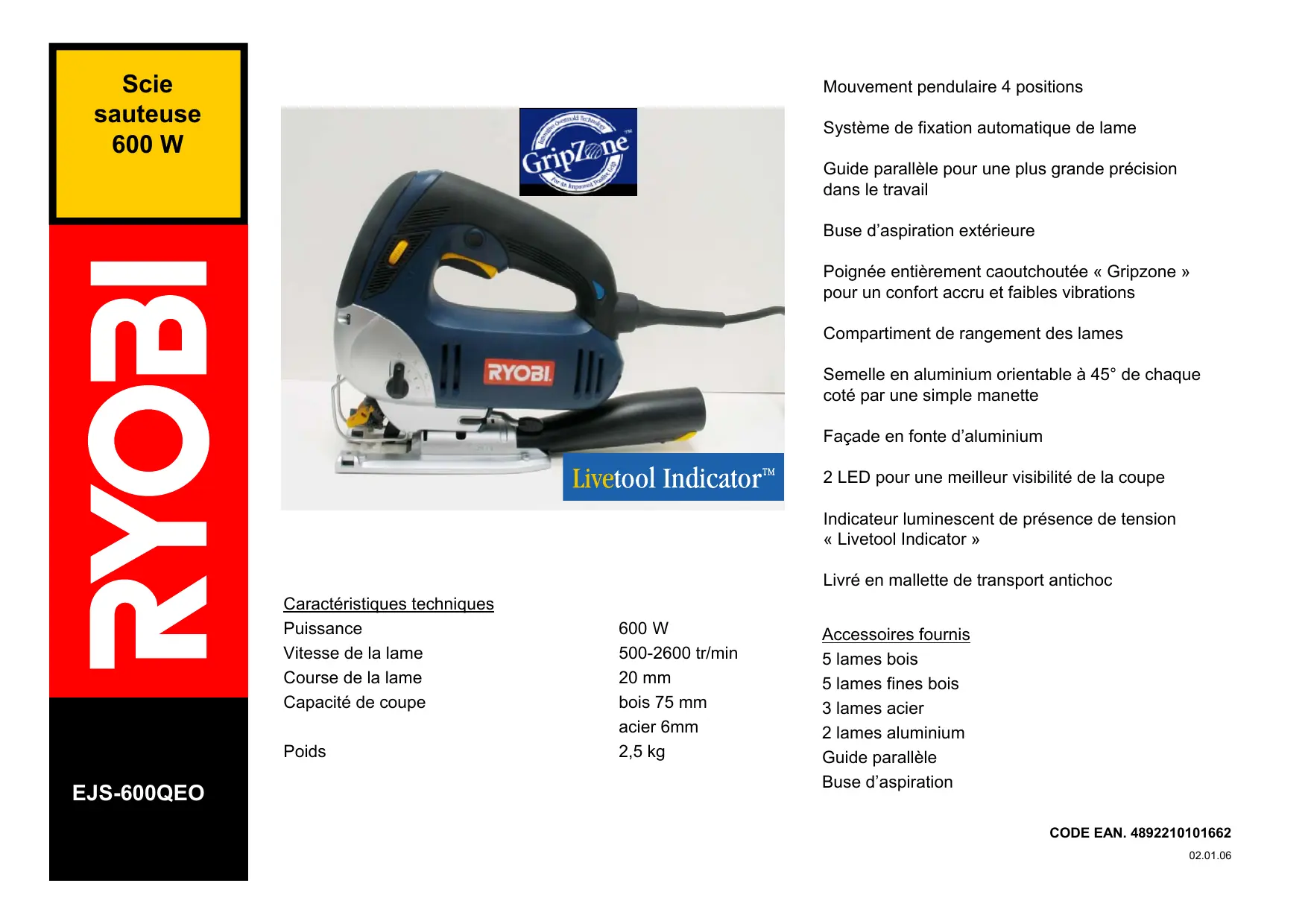 EJS-600QE0 Caractéristiques techniques Puissance Vitesse de la lame Course de la lame Capacité de coupe Poids 600 W 500-2600 tr/min 20 mm bois 75 mm acier 6mm 2,5 kg Mouvement pendulaire 4 positions Système de fixation automatique de lame Guide parallèle pour une plus grande précision dans le travail Buse d'aspiration extérieure Poignée entièrement caoutchoutée « Gripzone » pour un confort accru et faibles vibrations Compartiment de rangement des lames Semelle en aluminium orientable à 45° de chaque coté par une simple manette Façade en fonte d'aluminium 2 LED pour une meilleur visibilité de la coupe Indicateur luminescent de présence de tension « Livetool Indicator » Livré en mallette de transport antichoc Accessoires fournis 5 lames bois 5 lames fines bois 3 lames acier 2 lames aluminium Guide parallèle Buse d'aspiration CODE EAN. 4892210101662