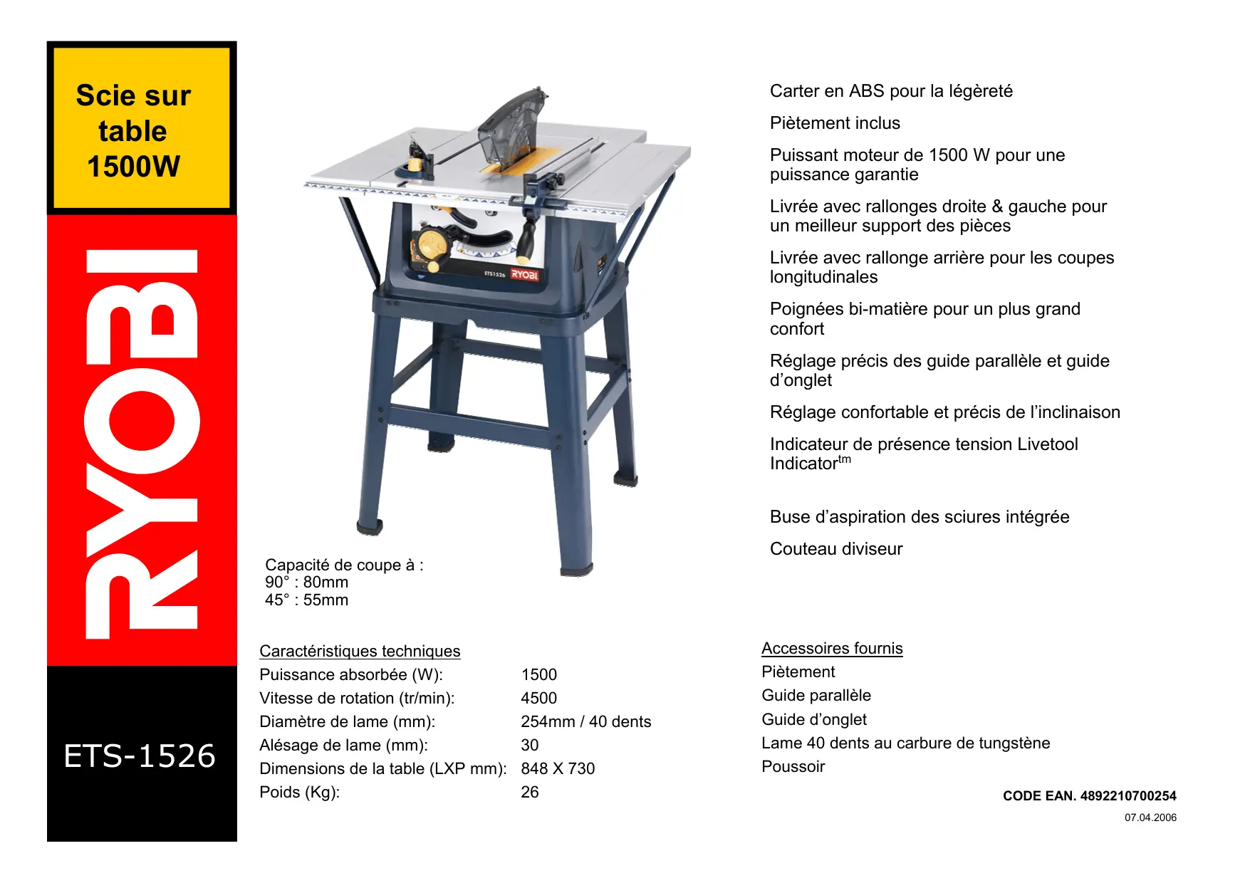 Téléchargez la notice de votre Scie à onglet au format PDF gratuitement ! Retrouvez votre notice ETS-1526 - RYOBI et reprennez votre appareil électronique en main. Sur cette page sont publiés tous les documents nécessaires à l'utilisation de votre appareil ETS-1526 de la marque RYOBI.