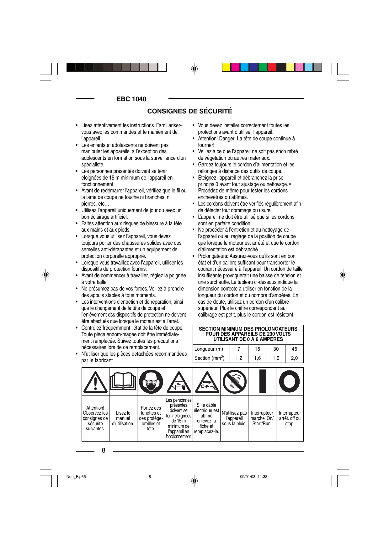 Section (mm2) 1,2 1,6 1,6 2,0 Les personnes présentes Si le câble Attention! Portez des doivent se électrique est Observez les Lisez le lunettes et N’utilisez pas Interrupteur abîmé consignes de manuel des protège- tenir éloignées l’appareil marche. On/ de 15 m enlevez la sécurité d’utilisation. oreilles et sous la pluie. Start/Run. minimum de fiche et suivantes. tête. l’appareil en remplacez-le. fonctionnement.