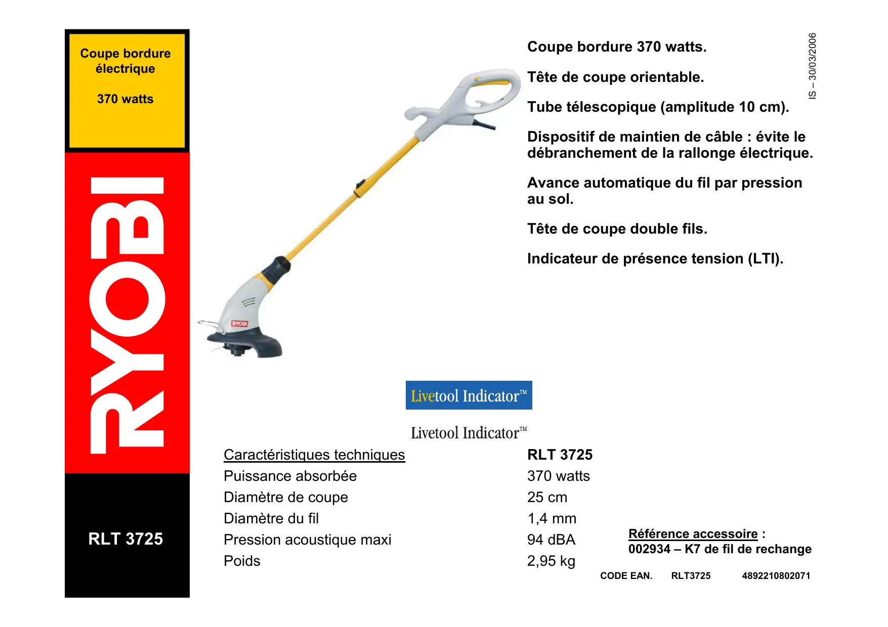 Tête de coupe orientable. 370 watts Tube télescopique (amplitude 10 cm). IS – 30/03/2006 Coupe bordure 370 watts. Coupe bordure électrique Dispositif de maintien de câble : évite le débranchement de la rallonge électrique. Avance automatique du fil par pression au sol. Tête de coupe double fils. Indicateur de présence tension (LTI). RLT 3725 Caractéristiques techniques Puissance absorbée Diamètre de coupe Diamètre du fil Pression acoustique maxi Poids RLT 3725 370 watts 25 cm 1,4 mm 94 dBA 2,95 kg Référence accessoire : 002934 – K7 de fil de rechange CODE EAN. RLT3725