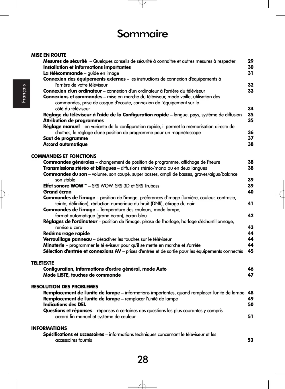 Sommaire MISE EN ROUTE Mesures de sécurité – Quelques conseils de sécurité à connaître et autres mesures à respecter Installation et informations importantes La télécommande – guide en image Connexion des équipements externes – les instructions de connexion d'équipements à l'arrière de votre téléviseur Connexion d'un ordinateur – connexion d'un ordinateur à l'arrière du téléviseur Connexions et commandes – mise en marche du téléviseur, mode veille, utilisation des commandes, prise de casque d'écoute, connexion de l'équipement sur le côté du téléviseur Réglage du téléviseur à l'aide de la Configuration rapide – langue, pays, système de diffusion Attribution de programmes Réglage manuel – en variante de la configuration rapide, il permet la mémorisation directe de chaînes, le réglage d'une position de programme pour un magnétoscope Saut de programme Accord automatique