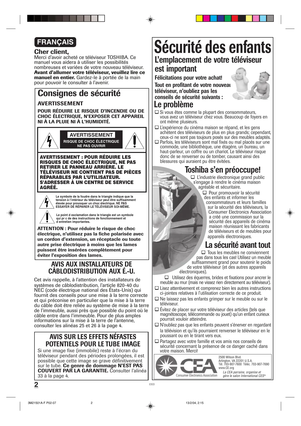 Merci d’avoir acheté ce téléviseur TOSHIBA. Ce manuel vous aidera à utiliser les possibilités nombreuses et variées de votre nouveau téléviseur. Avant d’allumer votre téléviseur, veuillez lire ce manuel en entier. Gardez-le à portée de la main pour pouvoir le consulter à l'avenir.