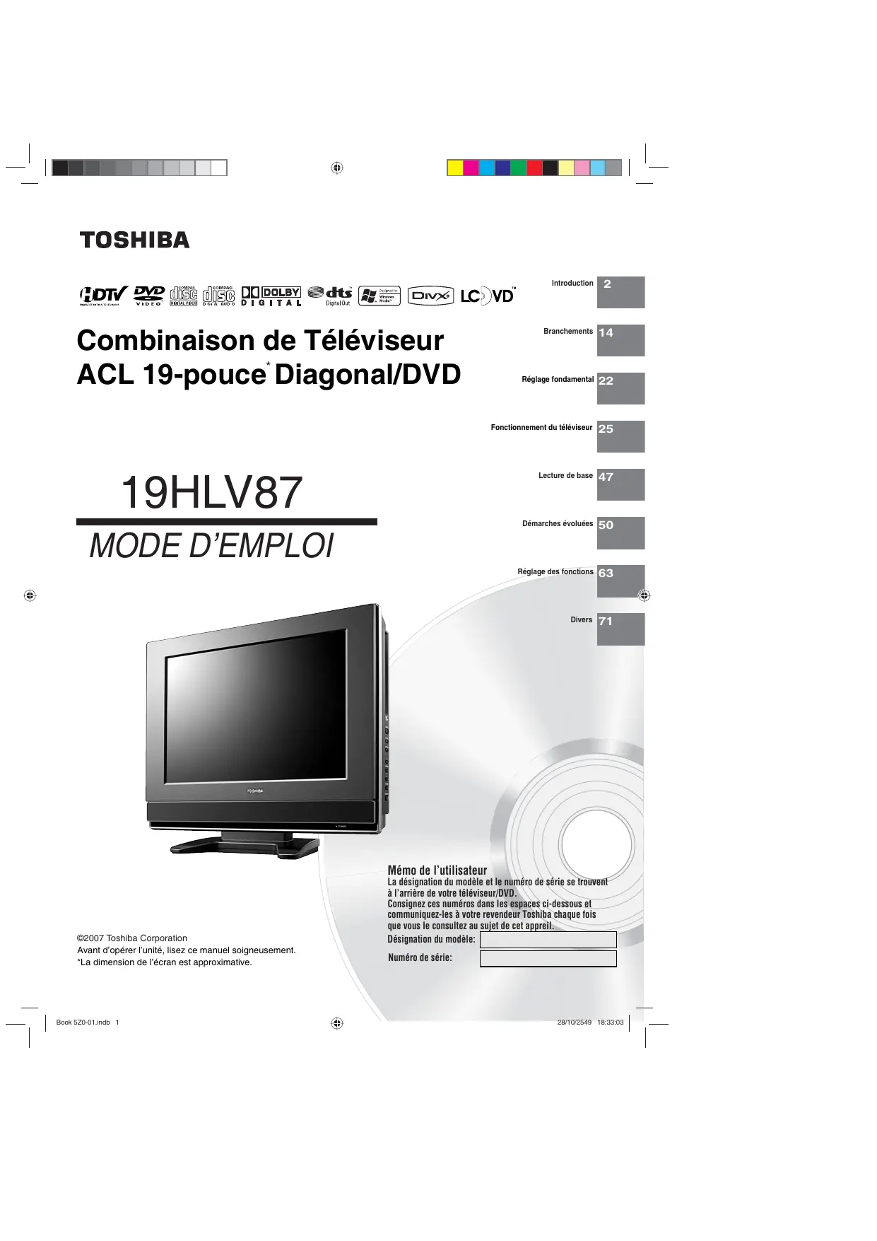 19HLV87 - Téléviseur avec lecteur DVD intégré TOSHIBA - Notice d'utilisation et mode d'emploi gratuit