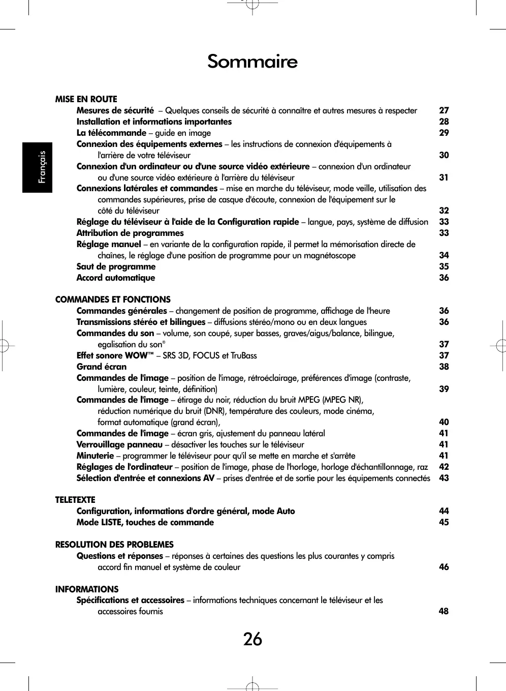 MISE EN ROUTE Mesures de sécurité – Quelques conseils de sécurité à connaître et autres mesures à respecter Installation et informations importantes La télécommande – guide en image Connexion des équipements externes – les instructions de connexion d'équipements à l'arrière de votre téléviseur Connexion d'un ordinateur ou d'une source vidéo extérieure – connexion d'un ordinateur ou d'une source vidéo extérieure à l'arrière du téléviseur Connexions latérales et commandes – mise en marche du téléviseur, mode veille, utilisation des commandes supérieures, prise de casque d'écoute, connexion de l'équipement sur le côté du téléviseur Réglage du téléviseur à l'aide de la Configuration rapide – langue, pays, système de diffusion Attribution de programmes Réglage manuel – en variante de la configuration rapide, il permet la mémorisation directe de chaînes, le réglage d'une position de programme pour un magnétoscope Saut de programme Accord automatique