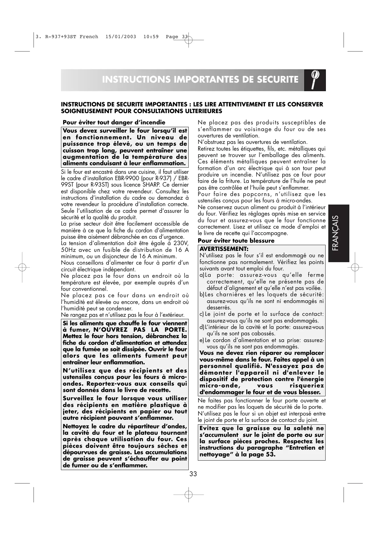 Pour éviter tout danger d'incendie Vous devez surveiller le four lorsqu'il est en fonctionnement. Un niveau de puissance trop élevé, ou un temps de cuisson trop long, peuvent entraîner une augmentation de la température des aliments conduisant à leur enflammation. Si le four est encastré dans une cuisine, il faut utiliser le cadre d'installation EBR-9900 (pour R-937) / EBR- 99ST {pour R-93ST) sous licence SHARP. Ce dernier est disponible chez votre revendeur. Consultez les instructions d'installation du cadre ou demandez à votre revendeur la procédure d'installation correcte. Seule l'utilisation de ce cadre permet d'assurer la sécurité et la qualité du produit. La prise secteur doit être facilement accessible de manière à ce que la fiche du cordon d'alimentation puisse être aisément débranchée en cas d'urgence. La tension d'alimentation doit être égale à 230V, 50Hz avec un fusible de distribution de 16 A minimum, ou un disjoncteur de 16 À minimum. Nous conseillons d'alimenter ce four à partir d'un circuit électrique indépendant. Ne placez pas le four dans un endroit où la température est élevée, par exemple auprès d'un four conventionnel. Ne placez pas ce four dans un endroit où l'humidité est élevée ou encore, dans un endroit où l'humidité peut se condenser. Ne rangez pas et n’utilisez pas le four à l'extérieur. Si les aliments que chauffe le four viennent à fumer, N'OUVREZ PAS LA PORTE. Mettez le four hors tension, débranchez la fiche du cordon d'alimentation et attendez que la fumée se soit dissipée. Ouvrir le four alors que les aliments fument peut entraîner leur enflammation. N'utilisez que des récipients et des ustensiles conçus pour les fours à micro- ondes. Reportez-vous aux conseils qui sont donnés dans le livre de recette. Surveillez le four lorsque vous utiliser des récipients en matière plastique à jeter, des récipients en Pa ier ou tout autre récipient pouvant s’enflammer. Nettoyez le cadre du répartiteur d'ondes, la cavité du four et le plateau tournant après chaque utilisation du four. Ces pièces doivent être toujours sèches et dépourvues de graisse. Les accumulations de graisse peuvent s’échauffer au point de fumer ou de s’enflammer.