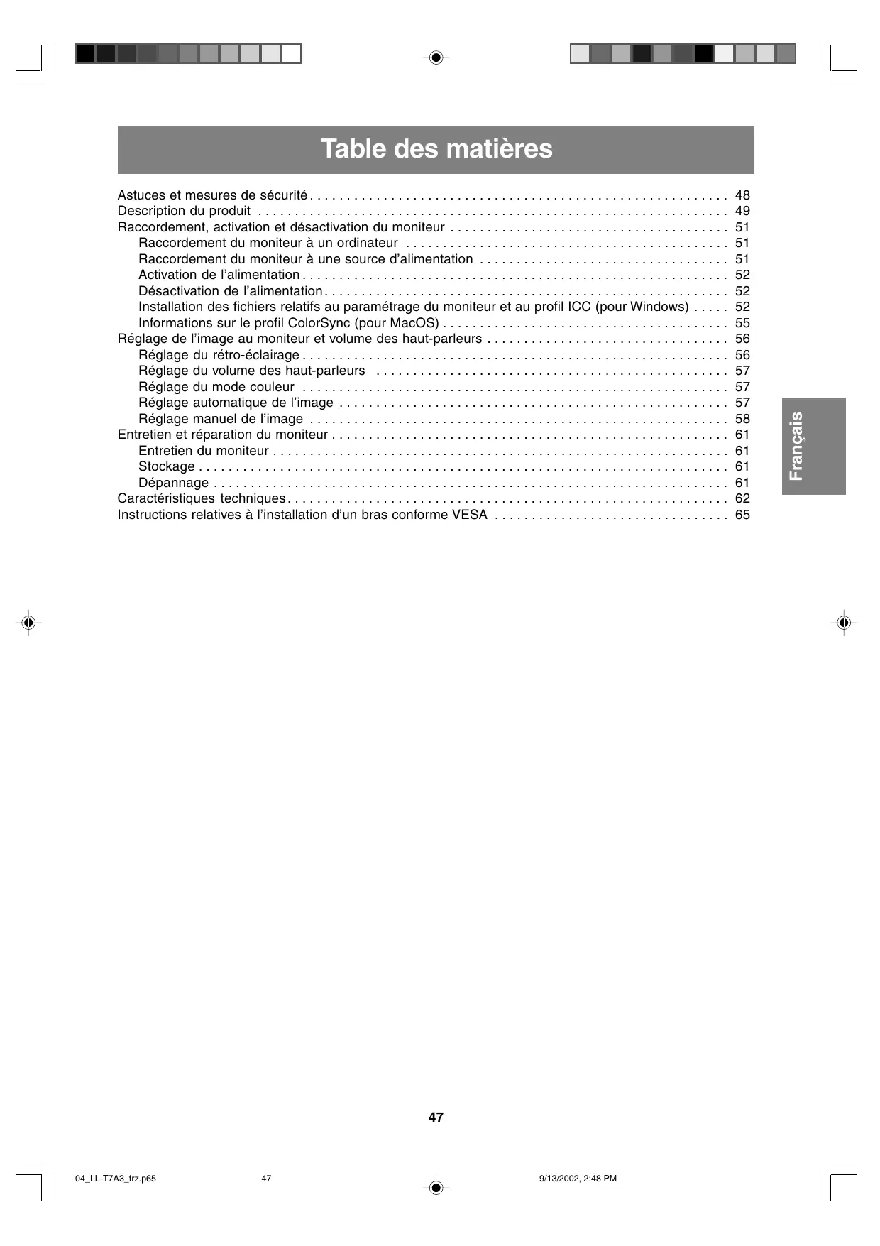 9/12/2002, 6:02 PM Dalle LCD Utiliser un chiffon doux et sec pour éliminer les poussières de la surface de la dalle du moniteur.