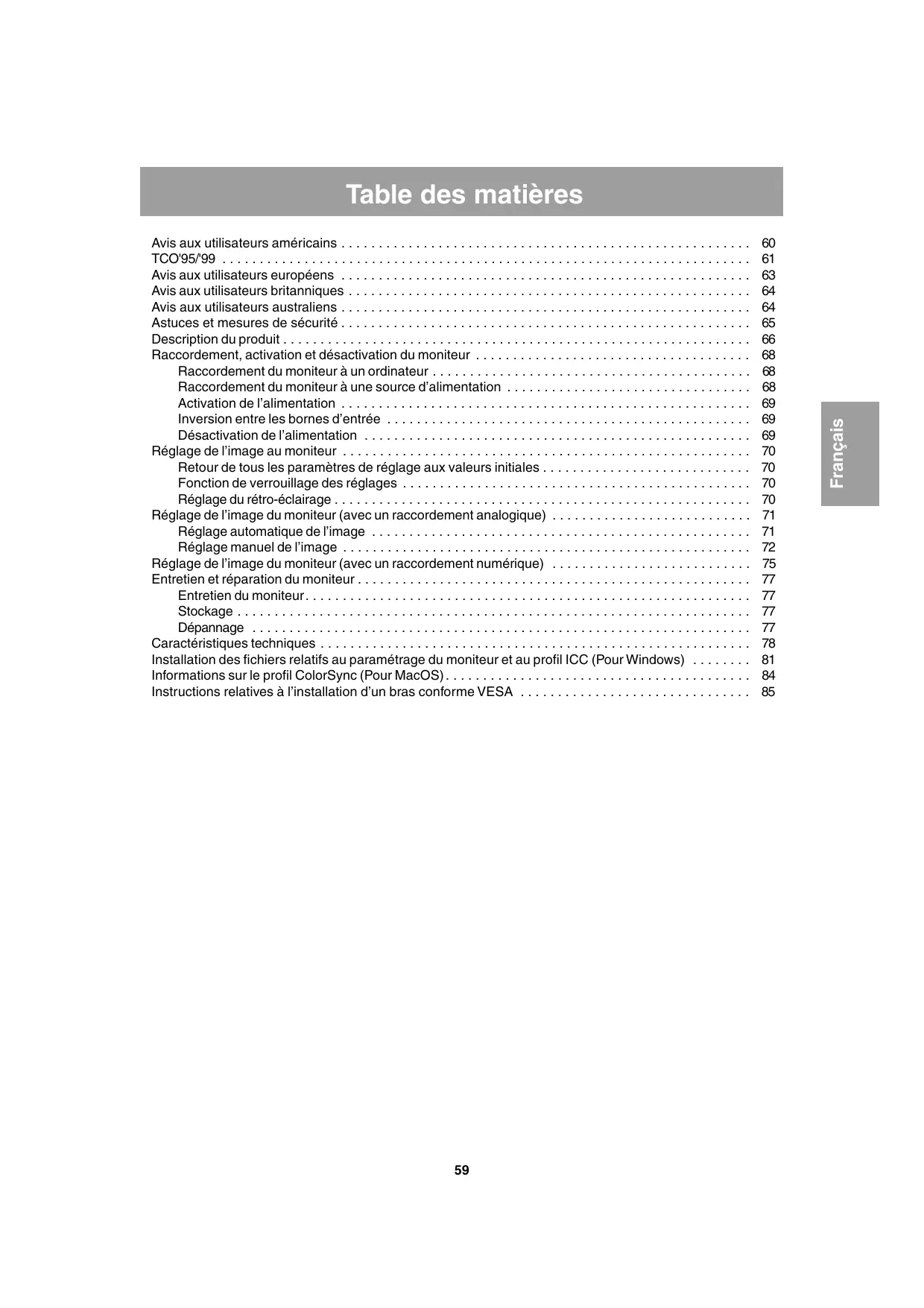 TCO'95/'99 . . . . . . . . . . . . . . . . . . . . . . . . . . . . . . . . . . . . . . . . . . . . . . . . . . . . . . . . . . . . . . . . . . . . . . . Avis aux utilisateurs européens . . . . . . . . . . . . . . . . . . . . . . . . . . . . . . . . . . . . . . . . . . . . . . . . . . . . . . . Avis aux utilisateurs britanniques . . . . . . . . . . . . . . . . . . . . . . . . . . . . . . . . . . . . . . . . . . . . . . . . . . . . . . Avis aux utilisateurs australiens . . . . . . . . . . . . . . . . . . . . . . . . . . . . . . . . . . . . . . . . . . . . . . . . . . . . . . . Astuces et mesures de sécurité . . . . . . . . . . . . . . . . . . . . . . . . . . . . . . . . . . . . . . . . . . . . . . . . . . . . . . . Description du produit . . . . . . . . . . . . . . . . . . . . . . . . . . . . . . . . . . . . . . . . . . . . . . . . . . . . . . . . . . . . . . . Raccordement, activation et désactivation du moniteur . . . . . . . . . . . . . . . . . . . . . . . . . . . . . . . . . . . . . Raccordement du moniteur à un ordinateur . . . . . . . . . . . . . . . . . . . . . . . . . . . . . . . . . . . . . . . . . . . Raccordement du moniteur à une source d’alimentation . . . . . . . . . . . . . . . . . . . . . . . . . . . . . . . . . Activation de l’alimentation . . . . . . . . . . . . . . . . . . . . . . . . . . . . . . . . . . . . . . . . . . . . . . . . . . . . . . . Inversion entre les bornes d’entrée . . . . . . . . . . . . . . . . . . . . . . . . . . . . . . . . . . . . . . . . . . . . . . . . . Désactivation de l’alimentation . . . . . . . . . . . . . . . . . . . . . . . . . . . . . . . . . . . . . . . . . . . . . . . . . . . . Réglage de l’image au moniteur . . . . . . . . . . . . . . . . . . . . . . . . . . . . . . . . . . . . . . . . . . . . . . . . . . . . . . . Retour de tous les paramètres de réglage aux valeurs initiales . . . . . . . . . . . . . . . . . . . . . . . . . . . . Fonction de verrouillage des réglages . . . . . . . . . . . . . . . . . . . . . . . . . . . . . . . . . . . . . . . . . . . . . . . Réglage du rétro-éclairage . . . . . . . . . . . . . . . . . . . . . . . . . . . . . . . . . . . . . . . . . . . . . . . . . . . . . . . . Réglage de l’image du moniteur (avec un raccordement analogique) . . . . . . . . . . . . . . . . . . . . . . . . . . . Réglage automatique de l’image . . . . . . . . . . . . . . . . . . . . . . . . . . . . . . . . . . . . . . . . . . . . . . . . . . . Réglage manuel de l’image . . . . . . . . . . . . . . . . . . . . . . . . . . . . . . . . . . . . . . . . . . . . . . . . . . . . . . . Réglage de l’image du moniteur (avec un raccordement numérique) . . . . . . . . . . . . . . . . . . . . . . . . . . . Entretien et réparation du moniteur . . . . . . . . . . . . . . . . . . . . . . . . . . . . . . . . . . . . . . . . . . . . . . . . . . . . . Entretien du moniteur . . . . . . . . . . . . . . . . . . . . . . . . . . . . . . . . . . . . . . . . . . . . . . . . . . . . . . . . . . . . Stockage . . . . . . . . . . . . . . . . . . . . . . . . . . . . . . . . . . . . . . . . . . . . . . . . . . . . . . . . . . . . . . . . . . . . . Dépannage . . . . . . . . . . . . . . . . . . . . . . . . . . . . . . . . . . . . . . . . . . . . . . . . . . . . . . . . . . . . . . . . . . . Caractéristiques techniques . . . . . . . . . . . . . . . . . . . . . . . . . . . . . . . . . . . . . . . . . . . . . . . . . . . . . . . . . . Installation des fichiers relatifs au paramétrage du moniteur et au profil ICC (Pour Windows) . . . . . . . . Informations sur le profil ColorSync (Pour MacOS) . . . . . . . . . . . . . . . . . . . . . . . . . . . . . . . . . . . . . . . . . Instructions relatives à l’installation d’un bras conforme VESA . . . . . . . . . . . . . . . . . . . . . . . . . . . . . . .
