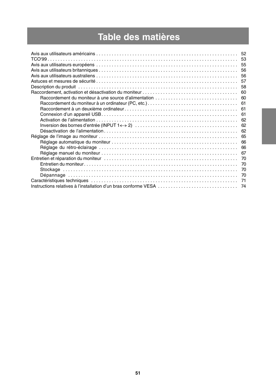 E Avis aux utilisateurs américains . . . . . . . . . . . . . . . . . . . . . . . . . . . . . . . . . . . . . . . . . . . . . . . . . . . . . . . TCO'99 . . . . . . . . . . . . . . . . . . . . . . . . . . . . . . . . . . . . . . . . . . . . . . . . . . . . . . . . . . . . . . . . . . . . . . . . . . Avis aux utilisateurs européens . . . . . . . . . . . . . . . . . . . . . . . . . . . . . . . . . . . . . . . . . . . . . . . . . . . . . . . Avis aux utilisateurs britanniques . . . . . . . . . . . . . . . . . . . . . . . . . . . . . . . . . . . . . . . . . . . . . . . . . . . . . . Avis aux utilisateurs australiens . . . . . . . . . . . . . . . . . . . . . . . . . . . . . . . . . . . . . . . . . . . . . . . . . . . . . . . Astuces et mesures de sécurité . . . . . . . . . . . . . . . . . . . . . . . . . . . . . . . . . . . . . . . . . . . . . . . . . . . . . . . Description du produit . . . . . . . . . . . . . . . . . . . . . . . . . . . . . . . . . . . . . . . . . . . . . . . . . . . . . . . . . . . . . . Raccordement, activation et désactivation du moniteur . . . . . . . . . . . . . . . . . . . . . . . . . . . . . . . . . . . . . Raccordement du moniteur à une source d’alimentation . . . . . . . . . . . . . . . . . . . . . . . . . . . . . . . . Raccordement du moniteur à un ordinateur (PC, etc.) . . . . . . . . . . . . . . . . . . . . . . . . . . . . . . . . . . . Raccordement à un deuxième ordinateur . . . . . . . . . . . . . . . . . . . . . . . . . . . . . . . . . . . . . . . . . . . . Connexion d’un appareil USB . . . . . . . . . . . . . . . . . . . . . . . . . . . . . . . . . . . . . . . . . . . . . . . . . . . . . Activation de l’alimentation . . . . . . . . . . . . . . . . . . . . . . . . . . . . . . . . . . . . . . . . . . . . . . . . . . . . . . . Inversion des bornes d’entrée (INPUT 1↔ 2) . . . . . . . . . . . . . . . . . . . . . . . . . . . . . . . . . . . . . . . . Désactivation de l’alimentation . . . . . . . . . . . . . . . . . . . . . . . . . . . . . . . . . . . . . . . . . . . . . . . . . . . . Réglage de l’image au moniteur . . . . . . . . . . . . . . . . . . . . . . . . . . . . . . . . . . . . . . . . . . . . . . . . . . . . . . Réglage automatique du moniteur . . . . . . . . . . . . . . . . . . . . . . . . . . . . . . . . . . . . . . . . . . . . . . . . . Réglage du rétro-éclairage . . . . . . . . . . . . . . . . . . . . . . . . . . . . . . . . . . . . . . . . . . . . . . . . . . . . . . Réglage manuel du moniteur . . . . . . . . . . . . . . . . . . . . . . . . . . . . . . . . . . . . . . . . . . . . . . . . . . . . . Entretien et réparation du moniteur . . . . . . . . . . . . . . . . . . . . . . . . . . . . . . . . . . . . . . . . . . . . . . . . . . . . Entretien du moniteur . . . . . . . . . . . . . . . . . . . . . . . . . . . . . . . . . . . . . . . . . . . . . . . . . . . . . . . . . . . . Stockage . . . . . . . . . . . . . . . . . . . . . . . . . . . . . . . . . . . . . . . . . . . . . . . . . . . . . . . . . . . . . . . . . . . . Dépannage . . . . . . . . . . . . . . . . . . . . . . . . . . . . . . . . . . . . . . . . . . . . . . . . . . . . . . . . . . . . . . . . . . Caractéristiques techniques . . . . . . . . . . . . . . . . . . . . . . . . . . . . . . . . . . . . . . . . . . . . . . . . . . . . . . . . . Instructions relatives à l’installation d’un bras conforme VESA . . . . . . . . . . . . . . . . . . . . . . . . . . . . . . .