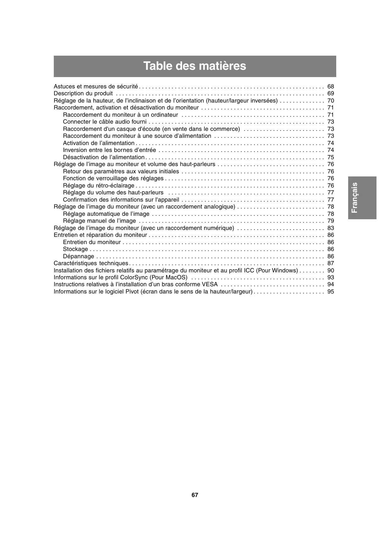 Astuces et mesures de sécurité 68 Description du produit . 69 Réglage de la hauteur, de l'inclinaison et de l'orientation (hauteurllargeur inversées) . . 70 Raccordement, activation et désactivation du moniteur . : -71 Raccordement du moniteur à un ordinateur .. -71 Connecter le câble audio fourni 73 Raccordement d'un casque d'écoute (en vente dans le commerce) . . 73 Raccordement du moniteur à une source d'alimentation . .. 73 Activation de l'alimentation 74 inversion entre les bornes d'entrée . 74 Désactivation de l'alimentation 75 Réglage de l'image au moniteur et volume des haut-parleurs . 76 Retour des paramètres aux valeurs initiales . 76 Fonction de verrouillage des réglages 76 Réglage du rétro-éclairage 76 9 Réglage du volume des haut-parleurs 77 Fi: Confirmation des informations sur l'appareil 77 = Réglage de l'image du moniteur (avec un raccordement analogique) . 78 a Réglage automatique de l'image . . 78 = Réglage manuel de l'image 79 Réglage de l'image du moniteur (avec un raccordement numérique) . 83 Entretien et réparation du moniteur . . 86 Entretien du moniteur . . 86 Stockage .. 86 Dépannage 86 Caractéristiques tecl niques 87 Installation des fichiers relatifs au paramétrage du moniteur ete au profil ICC (Pour Windows) 90 Informations sur le profil ColorSync (Pour MacOS) 93 Instructions relatives à l'installation d’un bras conforme VESA 94 Informations sur le logiciel Pivot (écran dans le sens de la hauteur/largeur). 95