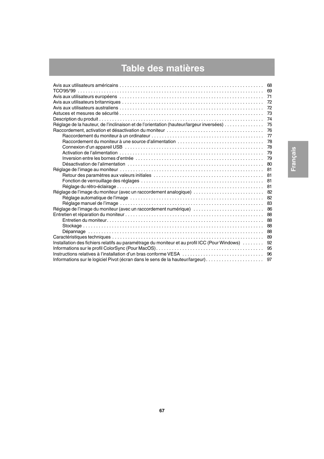 E Avis aux utilisateurs américains . . . . . . . . . . . . . . . . . . . . . . . . . . . . . . . . . . . . . . . . . . . . . . . . . . . . . . . TCO'95/'99 . . . . . . . . . . . . . . . . . . . . . . . . . . . . . . . . . . . . . . . . . . . . . . . . . . . . . . . . . . . . . . . . . . . . . . . Avis aux utilisateurs européens . . . . . . . . . . . . . . . . . . . . . . . . . . . . . . . . . . . . . . . . . . . . . . . . . . . . . . . Avis aux utilisateurs britanniques . . . . . . . . . . . . . . . . . . . . . . . . . . . . . . . . . . . . . . . . . . . . . . . . . . . . . . Avis aux utilisateurs australiens . . . . . . . . . . . . . . . . . . . . . . . . . . . . . . . . . . . . . . . . . . . . . . . . . . . . . . . Astuces et mesures de sécurité . . . . . . . . . . . . . . . . . . . . . . . . . . . . . . . . . . . . . . . . . . . . . . . . . . . . . . . Description du produit . . . . . . . . . . . . . . . . . . . . . . . . . . . . . . . . . . . . . . . . . . . . . . . . . . . . . . . . . . . . . . . Réglage de la hauteur, de l’inclinaison et de l’orientation (hauteur/largeur inversées) . . . . . . . . . . . . . . . Raccordement, activation et désactivation du moniteur . . . . . . . . . . . . . . . . . . . . . . . . . . . . . . . . . . . . . Raccordement du moniteur à un ordinateur . . . . . . . . . . . . . . . . . . . . . . . . . . . . . . . . . . . . . . . . . . . Raccordement du moniteur à une source d’alimentation . . . . . . . . . . . . . . . . . . . . . . . . . . . . . . . . . Connexion d’un appareil USB . . . . . . . . . . . . . . . . . . . . . . . . . . . . . . . . . . . . . . . . . . . . . . . . . . . . . Activation de l’alimentation . . . . . . . . . . . . . . . . . . . . . . . . . . . . . . . . . . . . . . . . . . . . . . . . . . . . . . . Inversion entre les bornes d’entrée . . . . . . . . . . . . . . . . . . . . . . . . . . . . . . . . . . . . . . . . . . . . . . . . . Désactivation de l’alimentation . . . . . . . . . . . . . . . . . . . . . . . . . . . . . . . . . . . . . . . . . . . . . . . . . . . . Réglage de l’image au moniteur . . . . . . . . . . . . . . . . . . . . . . . . . . . . . . . . . . . . . . . . . . . . . . . . . . . . . . . Retour des paramètres aux valeurs initiales . . . . . . . . . . . . . . . . . . . . . . . . . . . . . . . . . . . . . . . . . . Fonction de verrouillage des réglages . . . . . . . . . . . . . . . . . . . . . . . . . . . . . . . . . . . . . . . . . . . . . . . Réglage du rétro-éclairage . . . . . . . . . . . . . . . . . . . . . . . . . . . . . . . . . . . . . . . . . . . . . . . . . . . . . . . . Réglage de l’image du moniteur (avec un raccordement analogique) . . . . . . . . . . . . . . . . . . . . . . . . . . . Réglage automatique de l’image . . . . . . . . . . . . . . . . . . . . . . . . . . . . . . . . . . . . . . . . . . . . . . . . . . . Réglage manuel de l’image . . . . . . . . . . . . . . . . . . . . . . . . . . . . . . . . . . . . . . . . . . . . . . . . . . . . . . . Réglage de l’image du moniteur (avec un raccordement numérique) . . . . . . . . . . . . . . . . . . . . . . . . . . . Entretien et réparation du moniteur . . . . . . . . . . . . . . . . . . . . . . . . . . . . . . . . . . . . . . . . . . . . . . . . . . . . . Entretien du moniteur . . . . . . . . . . . . . . . . . . . . . . . . . . . . . . . . . . . . . . . . . . . . . . . . . . . . . . . . . . . . Stockage . . . . . . . . . . . . . . . . . . . . . . . . . . . . . . . . . . . . . . . . . . . . . . . . . . . . . . . . . . . . . . . . . . . . . Dépannage . . . . . . . . . . . . . . . . . . . . . . . . . . . . . . . . . . . . . . . . . . . . . . . . . . . . . . . . . . . . . . . . . . . Caractéristiques techniques . . . . . . . . . . . . . . . . . . . . . . . . . . . . . . . . . . . . . . . . . . . . . . . . . . . . . . . . . . Installation des fichiers relatifs au paramétrage du moniteur et au profil ICC (Pour Windows) . . . . . . . . Informations sur le profil ColorSync (Pour MacOS) . . . . . . . . . . . . . . . . . . . . . . . . . . . . . . . . . . . . . . . . . Instructions relatives à l’installation d’un bras conforme VESA . . . . . . . . . . . . . . . . . . . . . . . . . . . . . . . Informations sur le logiciel Pivot (écran dans le sens de la hauteur/largeur) . . . . . . . . . . . . . . . . . . . . . .