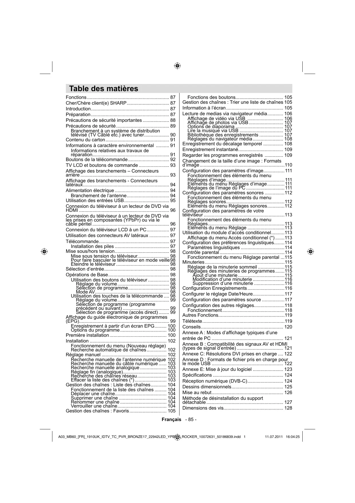 (X: Non disponible, O: Disponible) Dans certains cas, un signal sur l’écran du téléviseur LCD peut ne pas s’afficher correctement. Le problème peut être une incompatibilité avec les normes de l’équipement source (DVD, décodeur, etc.). Si vous rencontrez un tel problème, veuillez contacter votre fournisseur et le fabricant de l’appareil source. Français - 121 - A03_MB60_[FR]_1910UK_IDTV_TC_PVR_BRONZE17_22942LED_YPBPR_ROCKER_10072631_50186839.indd 37