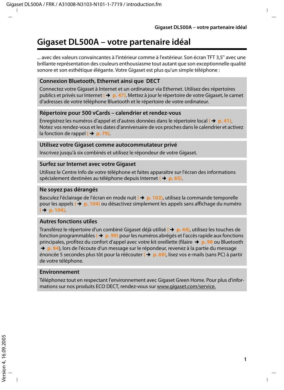 écran de veille (horloge analogique et numérique) u Téléchargement de sonneries u ECO-DECT u Réveil u Calendrier avec rappel de rendez-vous u Mode nuit avec désactivation programmée de la sonnerie u Surveillance de pièce u SMS jusqu'à 640 caractères www.gigaset.com/gigasetsl78h