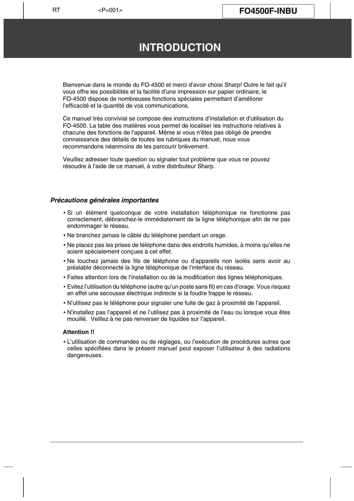 <P=001> FO4500F-INBU INTRODUCTION Bienvenue dans le monde du FO-4500 et merci d’avoir choisi Sharp! Outre le fait qu’il vous offre les possibilités et la facilité d’une impression sur papier ordinaire, le FO-4500 dispose de nombreuses fonctions spéciales permettant d’améliorer l’efficacité et la quantité de vos communications. Ce manuel très convivial se compose des instructions d’installation et d’utilisation du FO-4500. La table des matières vous permet de localiser les instructions relatives à chacune des fonctions de l’appareil. Même si vous n’êtes pas obligé de prendre connaissance des détails de toutes les rubriques du manuel, nous vous recommandons néanmoins de les parcourir brièvement. Veuillez adresser toute question ou signaler tout problème que vous ne pouvez résoudre à l’aide de ce manuel, à votre distributeur Sharp. Précautions générales importantes