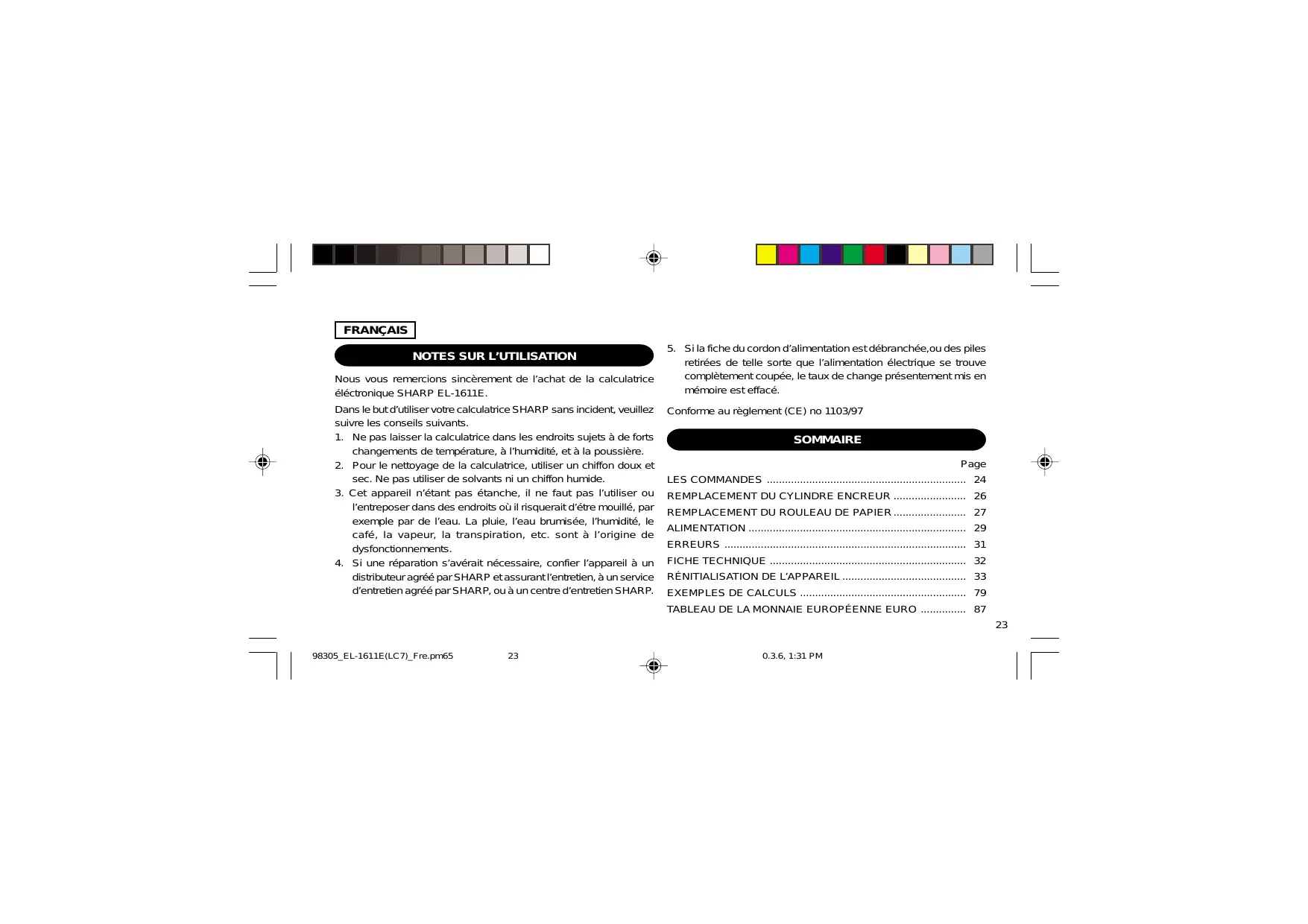 FRANÇAIS NOTES SUR L’UTILISATION Nous vous remercions sincèrement de l’achat de la calculatrice éléctronique SHARP EL-1611E. Dans le but d’utiliser votre calculatrice SHARP sans incident, veuillez suivre les conseils suivants. 1. Ne pas laisser la calculatrice dans les endroits sujets à de forts changements de température, à l’humidité, et à la poussière. 2. Pour le nettoyage de la calculatrice, utiliser un chiffon doux et sec. Ne pas utiliser de solvants ni un chiffon humide. 3. Cet appareil n’étant pas étanche, il ne faut pas l’utiliser ou l’entreposer dans des endroits où il risquerait d’étre mouillé, par exemple par de l’eau. La pluie, l’eau brumisée, l’humidité, le café, la vapeur, la transpiration, etc. sont à l’origine de dysfonctionnements. 4. Si une réparation s’avérait nécessaire, confier l’appareil à un distributeur agréé par SHARP et assurant l’entretien, à un service d’entretien agréé par SHARP, ou à un centre d’entretien SHARP.