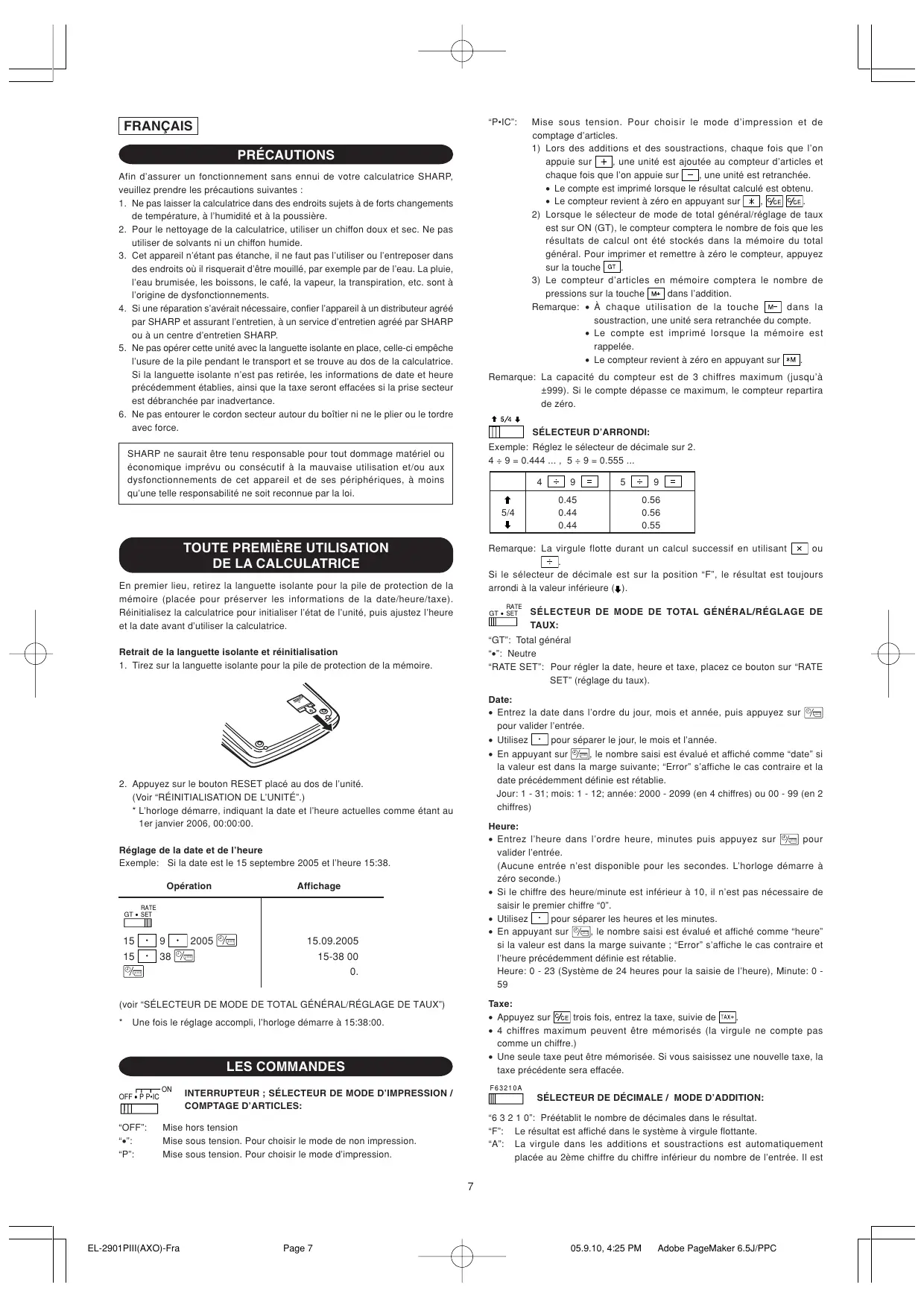 FRANÇAIS PRÉCAUTIONS Afin d’assurer un fonctionnement sans ennui de votre calculatrice SHARP, veuillez prendre les précautions suivantes :