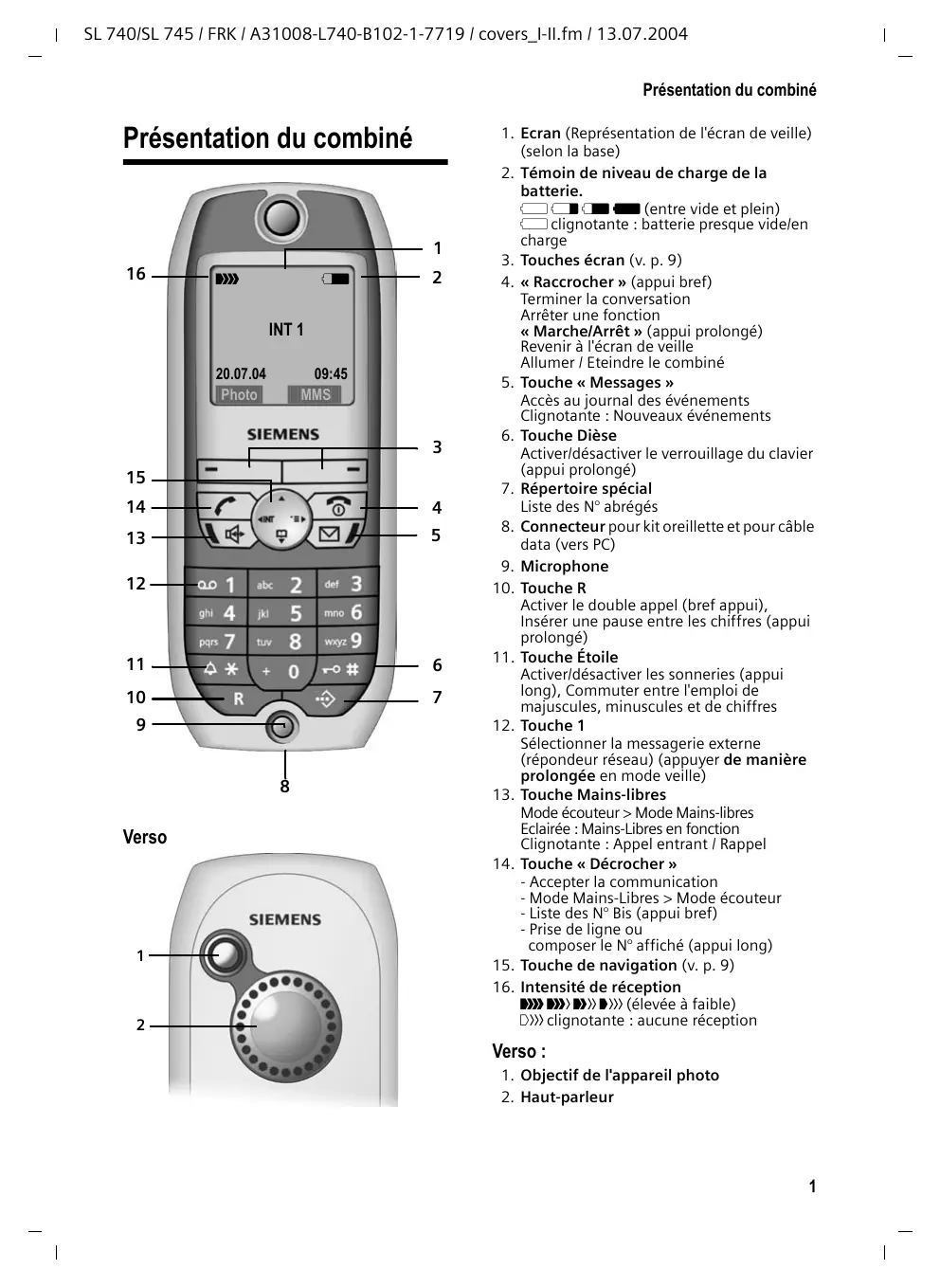 SL 740/SL 745 / FRK / A31008-L740-B102-1-7719 / starting.fm / 13.07.2004 Gigaset SL740 – Le téléphone et plus encore Gigaset SL740 – Le téléphone et plus encore Votre Gigaset SL740 comporte non seulement un appareil photo numérique intégré ainsi que la possibilité d'envoyer et de recevoir des MMS via le réseau fixe (p. 33) ; votre téléphone recèle des capacités encore plus remarquables : u Associez des photos à des fiches du répertoire, vous verrez affiché la photo de qui vous appelle (p. 18). u Enregistrez votre mélodie préférée avec votre combiné et créez votre propre sonnerie personnalisée (p. 56). u Marquez vos correspondants importants comme VIP – vous identifiez ainsi vos appels important à partir de leur sonnerie (p. 16). u Enregistrez les rendez-vous (p. 57) et les dates anniversaires (p. 17) dans votre téléphone – celui-ci vous rappelle à temps l'événement. Appréciez votre nouveau téléphone Préparer le téléphone L'emballage contient les éléments suivants : u une base Gigaset SL740 , u un combiné Gigaset SL74, u un bloc-secteur, u un câble de données, u un cordon téléphonique, u une batterie, u un couvercle de batterie, u un chargeur (avec son bloc secteur), u un mode d’emploi. Mise en place de la base et du chargeur La base et le chargeur sont prévus pour être exploités dans des locaux protégés, dans une plage de températures comprises entre +5 °C et +45 °C. Installer la base dans un endroit central de votre logement. À noter : u Veillez à protéger votre téléphone des facteurs suivant : sources de chaleur, rayons directs du soleil, autres appareils électriques. u Protégez votre Gigaset contre l'humidité, la poussière, les vapeurs et liquides corrosifs. Portée et intensité de réception Portée : u en terrain découvert : environ 300 m u à l'intérieur de bâtiments : environ 50 m Intensité de réception : L'écran affiche l'intensité du contact radio entre la base et le combiné u de bonne à faible : Ð i Ñ Ò u aucune réception : | clignotante