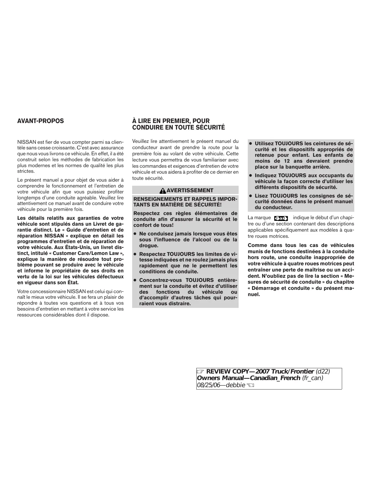 Nous approucions l'intérêt que vous portez à NiSSAN et vous remercions d'avoir acheté un vehicule de qualite NiSSAN.