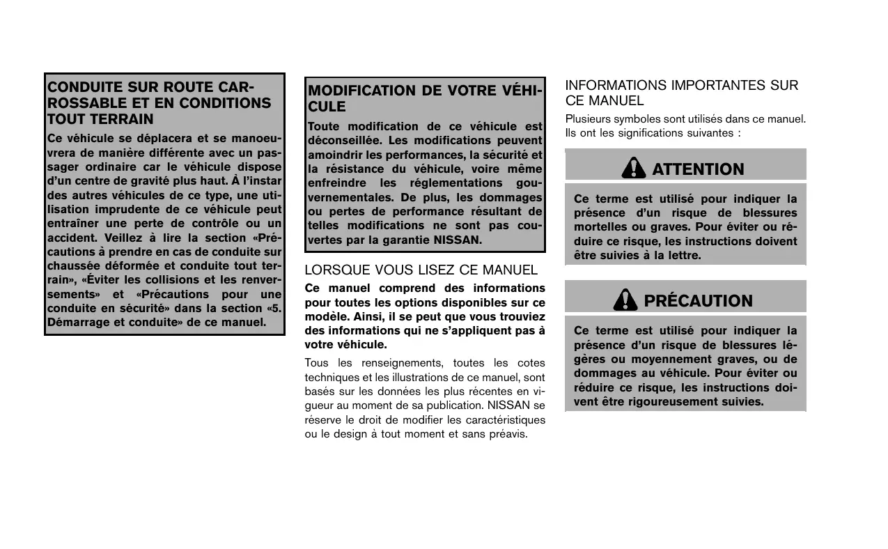 Toute modification de ce vehicule est déconseillée. Les modifications peuvent amoindre les performances, la sécurité et la résistance du vehicule, voir même enfreindre les réglementations gouvernementales. De plus, les dommages ou pertes de performance résultat de telles modifications ne sont pas couvertes par la garantie NISSAN.