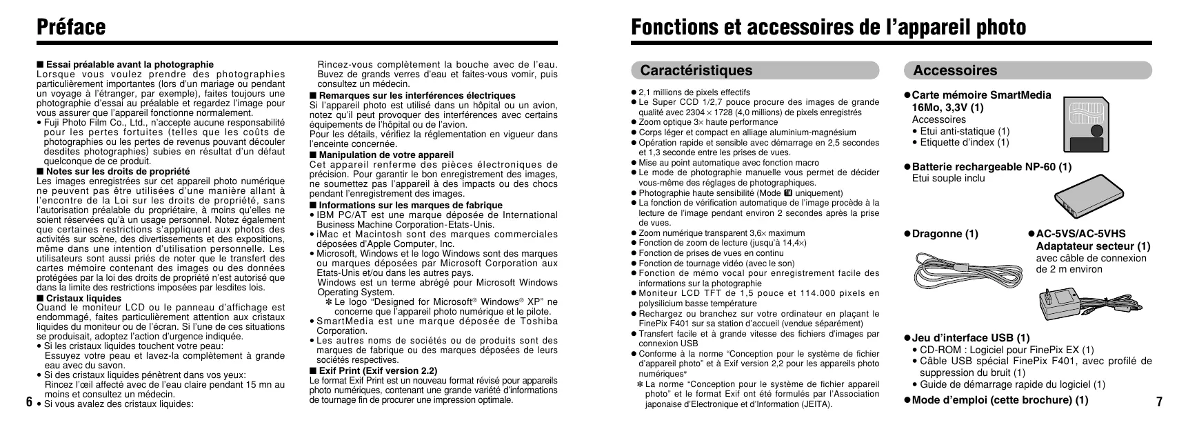 ■ Essai préalable avant la photographie Lorsque vous voulez prendre des photographies particulièrement importantes (lors d’un mariage ou pendant un voyage à l’étranger, par exemple), faites toujours une photographie d’essai au préalable et regardez l’image pour vous assurer que l’appareil fonctionne normalement. i Fuji Photo Film Co., Ltd., n’accepte aucune responsabilité pour les pertes fortuites (telles que les coûts de photographies ou les pertes de revenus pouvant découler desdites photographies) subies en résultat d’un défaut quelconque de ce produit. ■ Notes sur les droits de propriété Les images enregistrées sur cet appareil photo numérique ne peuvent pas être utilisées d’une manière allant à l’encontre de la Loi sur les droits de propriété, sans l’autorisation préalable du propriétaire, à moins qu’elles ne soient réservées qu’à un usage personnel. Notez également que certaines restrictions s’appliquent aux photos des activités sur scène, des divertissements et des expositions, même dans une intention d’utilisation personnelle. Les utilisateurs sont aussi priés de noter que le transfert des cartes mémoire contenant des images ou des données protégées par la loi des droits de propriété n’est autorisé que dans la limite des restrictions imposées par lesdites lois. ■ Cristaux liquides Quand le moniteur LCD ou le panneau d’affichage est endommagé, faites particulièrement attention aux cristaux liquides du moniteur ou de l’écran. Si l’une de ces situations se produisait, adoptez l’action d’urgence indiquée. i Si les cristaux liquides touchent votre peau: Essuyez votre peau et lavez-la complètement à grande eau avec du savon. i Si des cristaux liquides pénètrent dans vos yeux: Rincez l’œil affecté avec de l’eau claire pendant 15 mn au moins et consultez un médecin. i Si vous avalez des cristaux liquides: Fonctions et accessoires de l’appareil photo Rincez-vous complètement la bouche avec de l’eau. Buvez de grands verres d’eau et faites-vous vomir, puis consultez un médecin. ■ Remarques sur les interférences électriques Si I’appareil photo est utilisé dans un hôpital ou un avion, notez qu’il peut provoquer des interférences avec certains équipements de l’hôpital ou de l’avion. Pour les détails, vérifiez la réglementation en vigueur dans l’enceinte concernée. ■ Manipulation de votre appareil Cet appareil renferme des pièces électroniques de précision. Pour garantir le bon enregistrement des images, ne soumettez pas l’appareil à des impacts ou des chocs pendant l’enregistrement des images. ■ Informations sur les marques de fabrique i IBM PC/AT est une marque déposée de International Business Machine Corporation-Etats-Unis. i iMac et Macintosh sont des marques commerciales déposées d’Apple Computer, Inc. i Microsoft, Windows et le logo Windows sont des marques ou marques déposées par Microsoft Corporation aux Etats-Unis et/ou dans les autres pays. Windows est un terme abrégé pour Microsoft Windows Operating System. ✽ Le logo “Designed for Microsoft ® Windows® XP” ne concerne que l’appareil photo numérique et le pilote. i SmartMedia est une marque déposée de Toshiba Corporation. i Les autres noms de sociétés ou de produits sont des marques de fabrique ou des marques déposées de leurs sociétés respectives. ■ Exif Print (Exif version 2.2) Le format Exif Print est un nouveau format révisé pour appareils photo numériques, contenant une grande variété d’informations de tournage fin de procurer une impression optimale. Caractéristiques h 2,1 millions de pixels effectifs h Le Super CCD 1/2,7 pouce procure des images de grande qualité avec 2304 × 1728 (4,0 millions) de pixels enregistrés h Zoom optique 3× haute performance h Corps léger et compact en alliage aluminium-magnésium h Opération rapide et sensible avec démarrage en 2,5 secondes et 1,3 seconde entre les prises de vues. h Mise au point automatique avec fonction macro h Le mode de photographie manuelle vous permet de décider vous-même des réglages de photographiques. h Photographie haute sensibilité (Mode 1 uniquement) h La fonction de vérification automatique de l’image procède à la lecture de l’image pendant environ 2 secondes après la prise de vues. h Zoom numérique transparent 3,6× maximum h Fonction de zoom de lecture (jusqu’à 14,4×) h Fonction de prises de vues en continu h Fonction de tournage vidéo (avec le son) h Fonction de mémo vocal pour enregistrement facile des informations sur la photographie h Moniteur LCD TFT de 1,5 pouce et 114.000 pixels en polysilicium basse température h Rechargez ou branchez sur votre ordinateur en plaçant le FinePix F401 sur sa station d’accueil (vendue séparément) h Transfert facile et à grande vitesse des fichiers d’images par connexion USB h Conforme à la norme “Conception pour le système de fichier d’appareil photo” et à Exif version 2,2 pour les appareils photo numériques✽ ✽ La norme “Conception pour le système de fichier appareil photo” et le format Exif ont été formulés par l’Association japonaise d’Electronique et d’Information (JEITA). Accessoires h Carte mémoire SmartMedia 16Mo, 3,3V (1) Accessoires i Etui anti-statique (1) i Etiquette d’index (1) h Batterie rechargeable NP-60 (1) Etui souple inclu h Dragonne (1) h AC-5VS/AC-5VHS Adaptateur secteur (1) avec câble de connexion de 2 m environ h Jeu d’interface USB (1) i CD-ROM : Logiciel pour FinePix EX (1) i Câble USB spécial FinePix F401, avec profilé de suppression du bruit (1) i Guide de démarrage rapide du logiciel (1) h Mode d’emploi (cette brochure) (1)