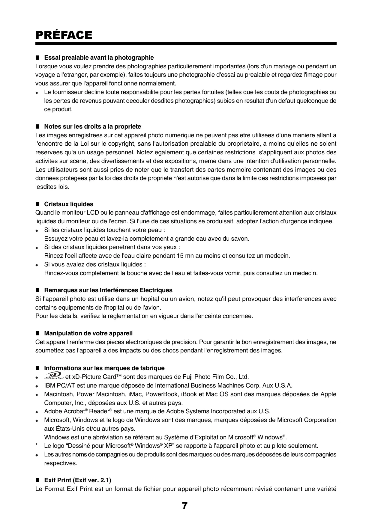 Etant donné que les xD-Picture Cards sont petites, elles peuvent être facilement avalées par les petits enfants. Prenez soin de ranger les xD-Picture Cards hors de portée des petits enfants. Si un enfant avale accidentellement une xD-Picture Card, contactez immédiatement un médecin.