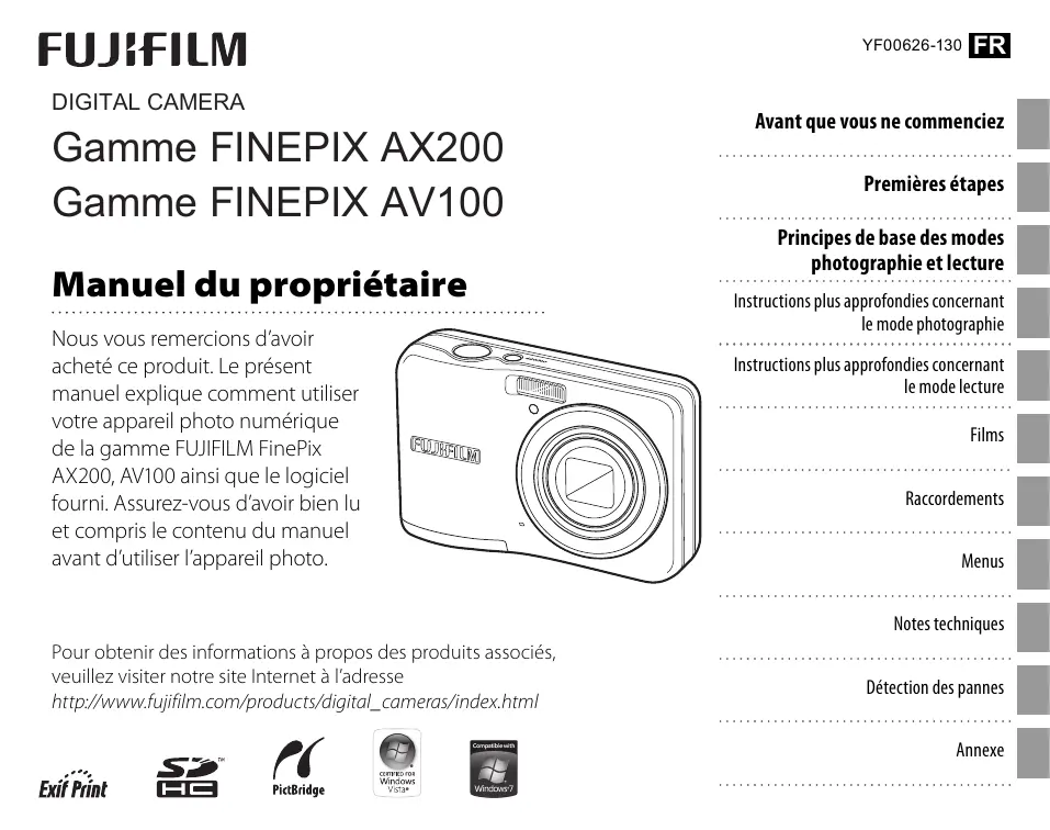 DIGITAL CAMERA Gamme FINEPIX AX200 Gamme FINEPIX AV100 Avant que vous ne commenciez Premières étapes Principes de base des modes M I d CPP photographie et lecture Manuel du propriétaire icons pusapprofndes canceant le mode photographie Nous vous remercions d'avoir acheté ce produit. Le présent manuel explique comment utiliser votre appareil photo numérique de la gamme FUJIFILM FinePix AX200, AV100 ainsi que le logiciel fourni. Assurez-vous d'avoir bien lu et compris le contenu du manuel avant d'utiliser l'appareil photo. Instructions plus approfondies concernant le mode lecture Fims vw D Raccordements Menus Notes steciues Pour obtenir des informations à propos des produits associés, veuillez visiter notre site Internet à l'adresse Détection d htip/mnfujifimcom/products/digital_ cameras/index.htmi ÉTECION GES pannes es « É Li E | | = Annexe PidBridge va"