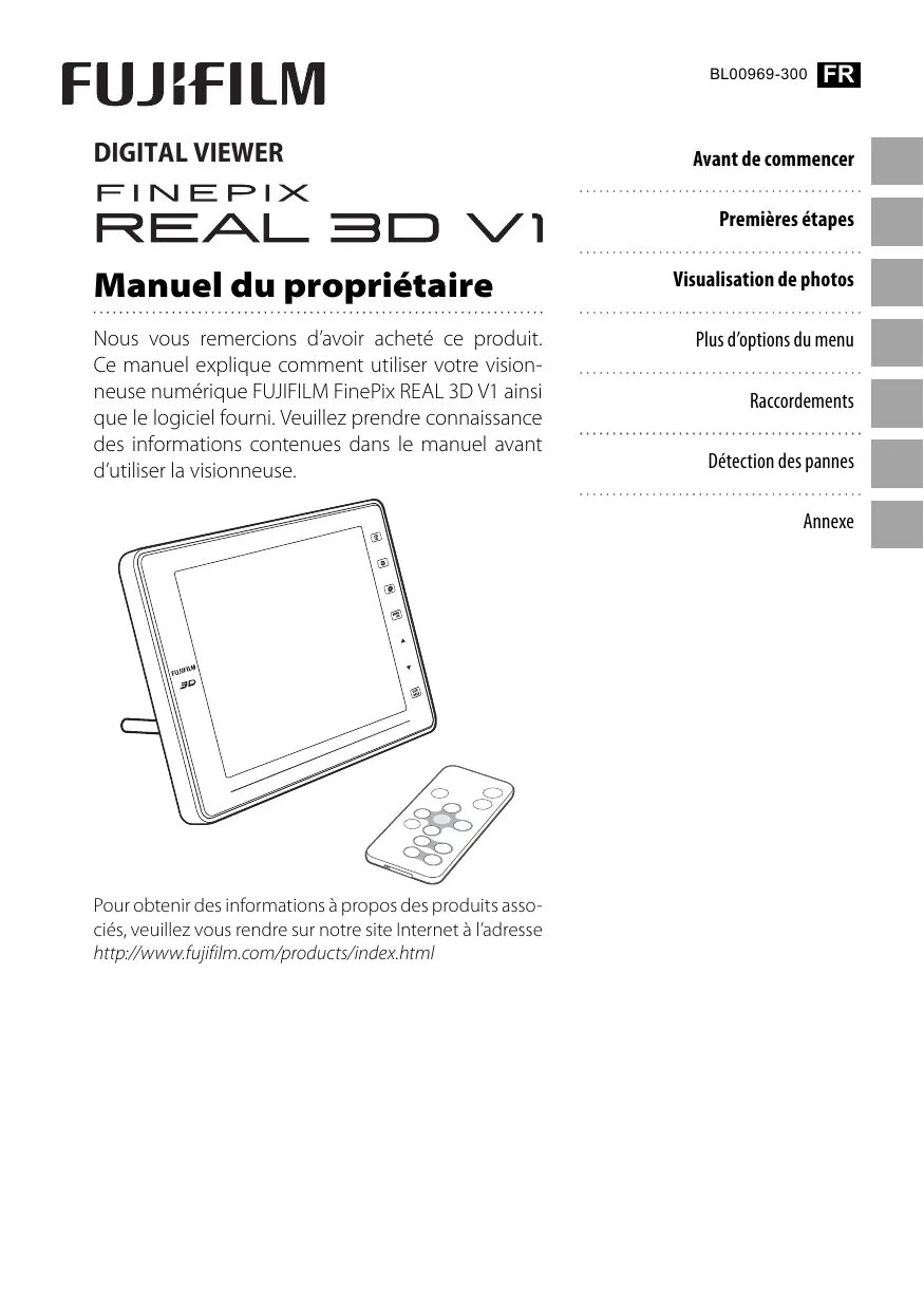 Nous vous remercions d'avoir acheté ce produit. Ce manuel explique comment utiliser votre visionneuse numérique FUJIFILM FinePix REAL 3D V1 ainsi que le logiciel fourni. Veuiliez prendre connaissance des informations containues dans le manuel avant d'utiliser la visionneuse.