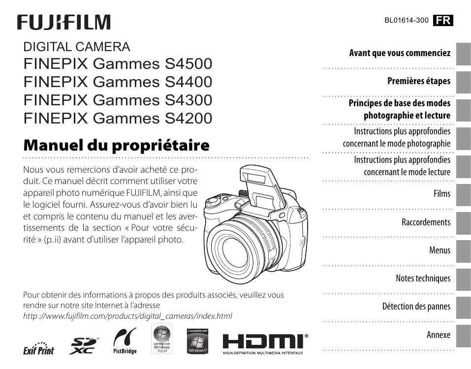 • E et la carte xD-Picture Card™ sont des marques commerciales de FUJIFILM Corporation. • IBM PC/AT est une marque déposée de International Business Machine Corporation-Etats-Unis. • Macintosh, QuickTime et Mac OS sont des marques de Apple Inc. aux ÉtatsUnis et dans d’autres pays. • Windows 7, Windows Vista et le logo Windows sont des marques du groupe de sociétés Microsoft. • La marque commerciale IrSimple™ appartient a l’IrDA (Infrared Data Association®). • La marque commerciale IrSS™ ou IrSimpleShot™ appartient à Infrared Data Association®. • Les logos SDHC et SDXC sont des marques commerciales de SD-3C, LLC. • Le logo HDMI est une marque commerciale. • YouTube est une marque commerciale de Google Inc.