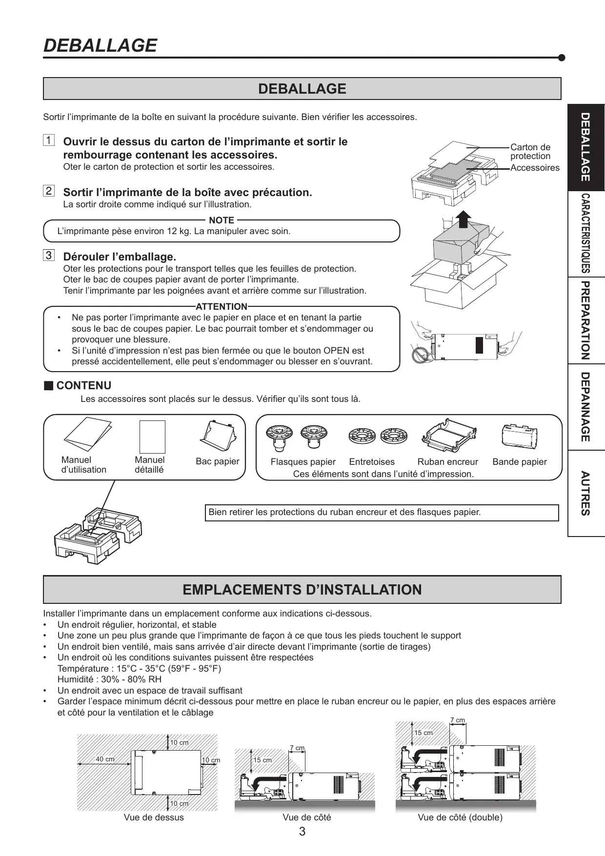 DEBALLAGE DEBALLAGE Sortir l'imprimante de la boîte en suivant la procédure suivante. Bien vérifier les accessoires. Ouvrir le dessus du carton de l’imprimante et sortir le Carton de rembourrage contenant les accessoires. protection Oter le carton de protection et sortir les accessoires. Accessoires Sortir l’imprimante de la boîte avec précaution. La sortir droite comme indiqué sur l'illustration. NOTE ( L'imprimante pèse environ 12 kg. La manipuler avec soin. Dérouler l’emballage. Oter les protections pour le transport telles que les feuilles de protection. Oter le bac de coupes papier avant de porter l'imprimante. Tenir l'imprimante par les poignées avant et arrière comme sur l'illustration. ATTENTION + Ne pas porter l'imprimante avec le papier en place et en tenant la partie sous le bac de coupes papier. Le bac pourrait tomber et s'endommager ou provoquer une blessure. + Si l'unité d'impression n'est pas bien fermée ou que le bouton OPEN est pressé accidentellement, elle peut s'endommager ou blesser en s'ouvrant.