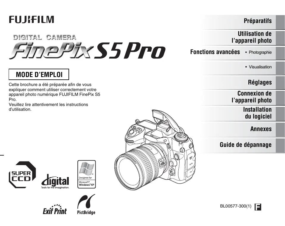 Cette brochure a été préparée afin de vous expliquer comment utiliser correctement votre appareil photo numérique FUJIFILM FinePix S5 Pro. Veuillez lire attentivement les instructions d’utilisation. Réglages Connexion de l’appareil photo Installation du logiciel Annexes Guide de dépannage BL00577-300(1) Avertissement Pour les utilisateurs au Canada ATTENTION Cet appareil photo numérique de la classe B est conforme à la norme NMB-003 du Canada. Veuillez lire les Notes pour la sécurité (➝p.238) et vous assurer de bien les assimiler avant d’utiliser l’appareil photo.