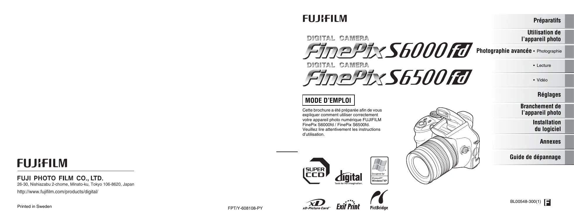 Cette brochure a été préparée afin de vous expliquer comment utiliser correctement votre appareil photo numérique FUJIFILM FinePix S6000fd / FinePix S6500fd. Veuillez lire attentivement les instructions d’utilisation. Réglages Branchement de l’appareil photo Installation du logiciel Annexes Guide de dépannage 26-30, Nishiazabu 2-chome, Minato-ku, Tokyo 106-8620, Japan http://www.fujifilm.com/products/digital/ BL00548-300(1) Printed in Sweden