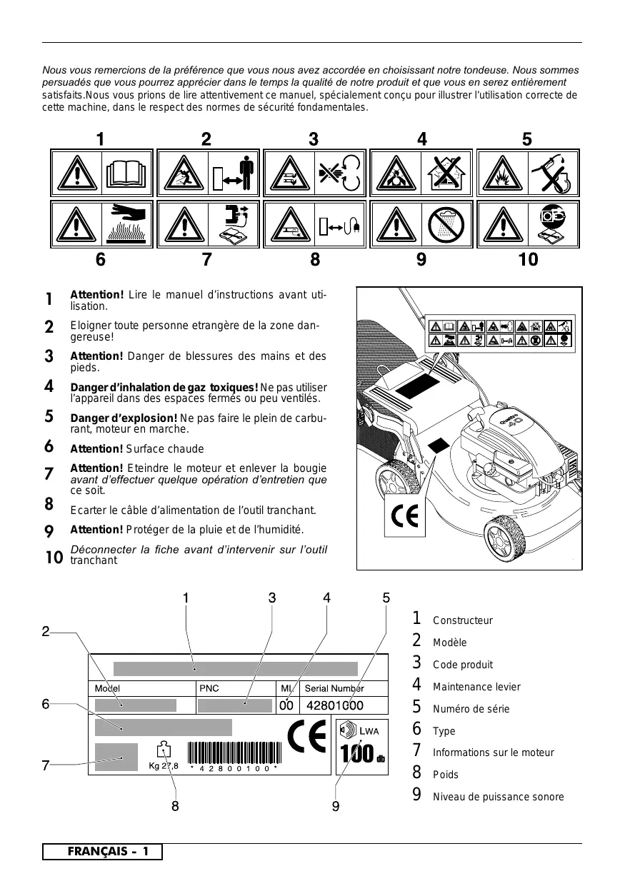 Lisez toutes les instructions soigneusement. Familiarisez vous avec les commandes pour apprendre à utiliser efficacement cette machine. Ne jamais autoriser les enfants ou les personnes qui n’auraient pas lu ce manuel d’utilisation à utiliser cete tondeuse. La règlementation locale peut de plus interdire l’utilisation de telle machine au-dessous d’un certain âge. Ne jamais tondre à proximité de personnes, d’enfants ou d’animaux. Ne pas oublier que tout utilisateur ou propriétaire d’un tondeuse à gazon est responsable des accidents ou dommages causés à une personne ou a ses biens.