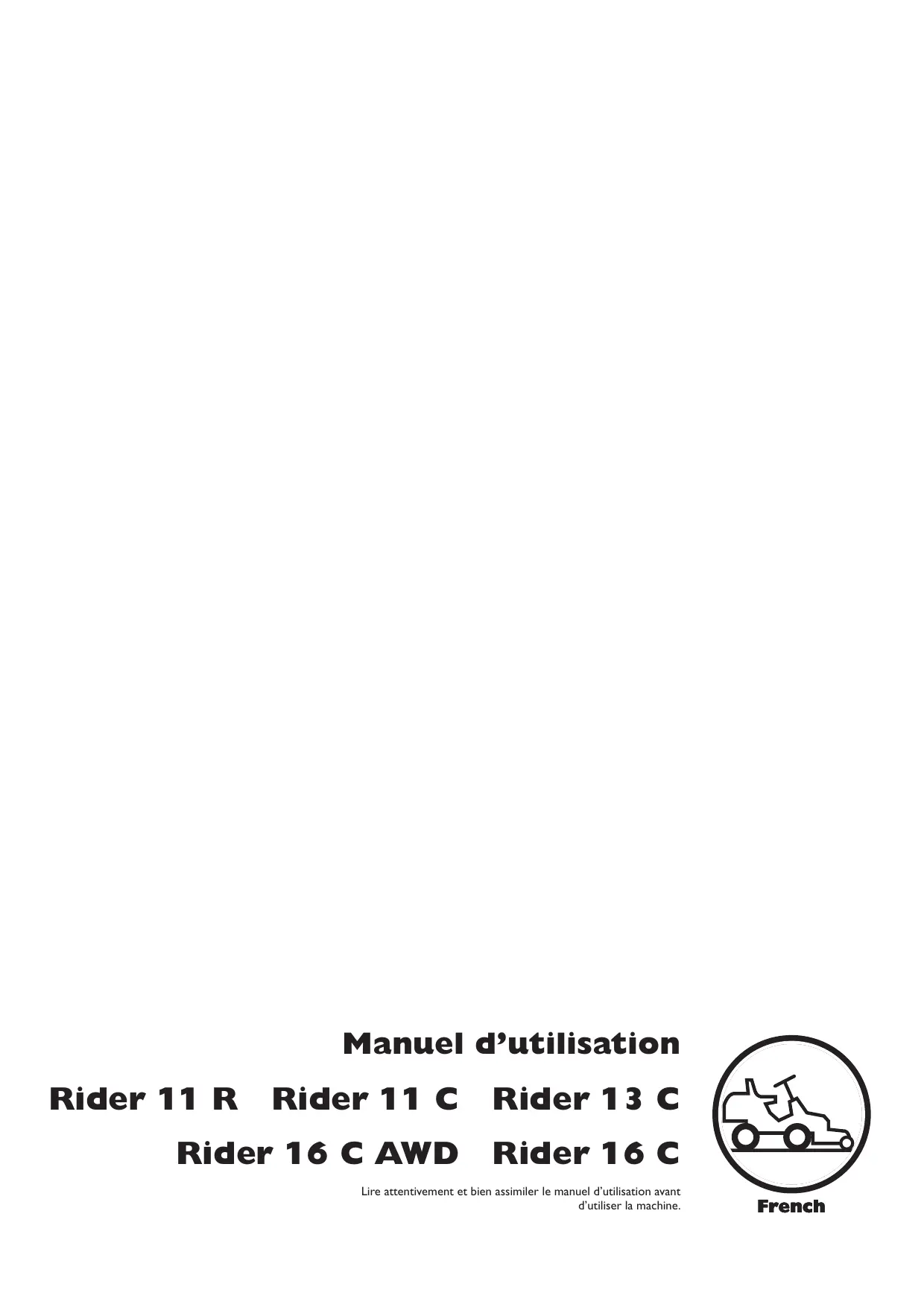 Instructions de sécurité ................................................ Conduite dans les pentes ............................................ Enfants ......................................................................... Entretien ...................................................................... Transport ...................................................................... QUELS SONT LES COMPOSANTS? Emplacement des commandes ................................... PRÉSENTATION Présentation ................................................................. Unité de coupe ............................................................. Levier de levage de l’unité de coupe ............................ Levier de réglage de la hauteur de coupe ................... Siège ............................................................................ Remplissage de carburant ........................................... Commande de débrayage ............................................ Commande de débrayage ............................................ Conduite Avant le démarrage ...................................................... Démarrer le moteur ...................................................... Démarrage d’un moteur avec batterie faible ............... Conduite de la tondeuse autoportée ............................ Conseils pratiques pour tondre .................................... Démarrage en côte, boîte de vitesses manuelle (Rider 11 R et Rider 11 C). ..................................................... Arrêt du moteur ............................................................ Entretien Schéma d’entretien ...................................................... Nettoyage ..................................................................... Démontage des carters et des ailes de la tondeuse autoportée .................................................................... Contrôle et réglage des câbles de direction ................. Contrôle du frein Rider 11 R et Rider 11 C .................. Réglage du frein .......................................................... Réglage du frein de stationnement .............................. Réglage du frein de stationnement .............................. Réglage du câble d’accélération .................................. Changement du filtre à air ........................................... Changement de l’huile moteur ..................................... Contrôle du filtre à air de la pompe d’alimentation ...... Vérification de la pression des pneus .......................... 2 – French