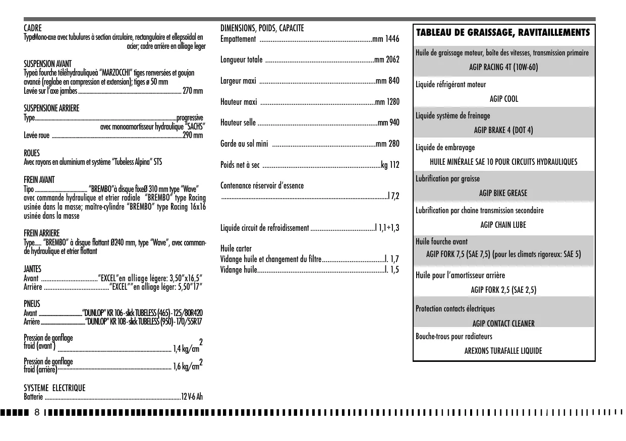 Huile de graissage moteur, boîte des vitesses, transmission primaire AGIP RACING 4T (10W-60) Liquide réfrigérant moteur AGIP COOL Hauteur maxi ..............................................................mm 1280 Hauteur selle .................................................................mm 940 Garde au sol mini ........................................................mm 280 Poids net à sec ................................................................kg 112 Contenance réservoir d’essence ..................................................................................................l 7,2 Liquide système de freinage AGIP BRAKE 4 (DOT 4) Liquide de embrayage HUILE MINÉRALE SAE 10 POUR CIRCUITS HYDRAULIQUES Lubrification par graisse