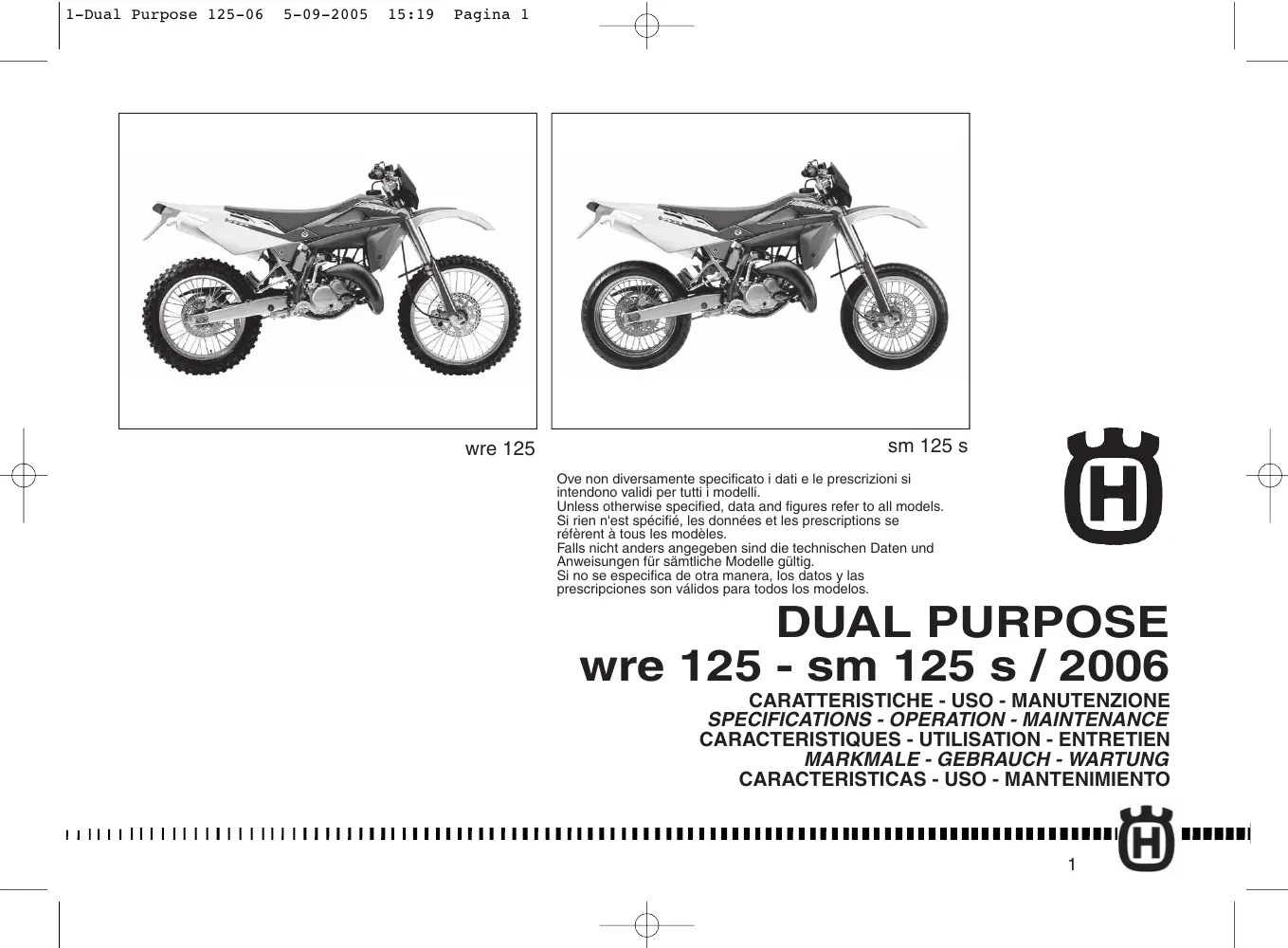 RECOMMENDED MAINTENANCE PROCEDURES You will find the approved maintenance procedures on the coupons. These procedures have been worked service personnel. It will be the owners responsibility to take care of these periodic services. Bring the coupon booklet along when you visit your dealer at the specified mileages to have your motorcycle inspected and serviced. Have your dealer sign the service coupon stubs for required proof of service during the warranty period. Dealer charges for the recommended Service Procedures are nominal - you will be repaid with long, trouble-free service and will protect your investment in a quality Husqvarna product. ENTRETIEN RECOMMANDE Toute opération d’entretien recommandé référée sur les coupons a été conçue par le personnel du service technique. L’exploitation des interventions périodiques énumérées dans chaque coupon, devra être soignée par l’Usager sous sa propre responsabilité. Votre carnet doit vous suivre toujours lorsque vous amenez votre moto chez le Concessionnaire pour l’entretien périodique. Faites signer le Coupon de Service à chaque intervention. Les frais d’entretien périodique recommandé sont purement nominaux. En suivant ces recommandations, vous serez récompensés par une longue durée de votre moto sans avoir d'ennuis ou défauts. 1-Dual Purpose 125-06 5-09-2005 15:19 Pagina 13