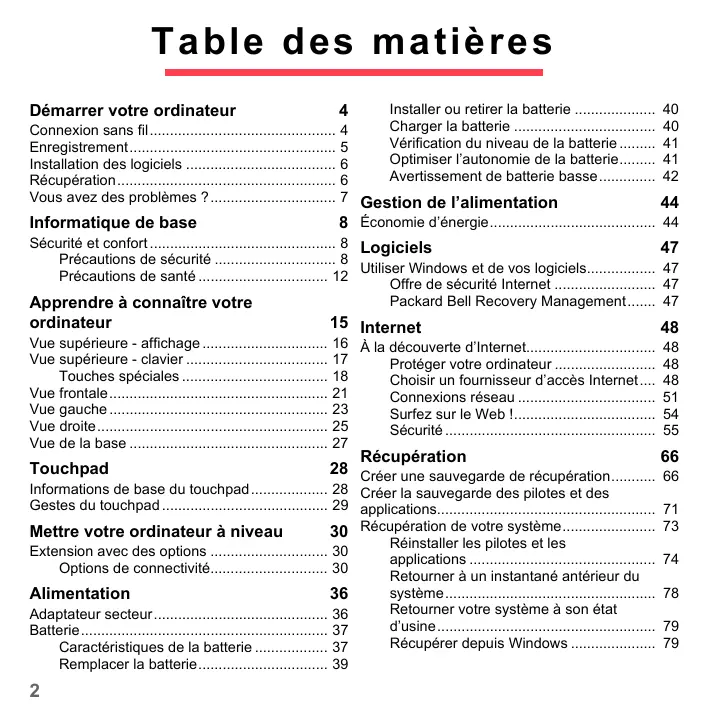 Installer ou retirer la batterie .................... Charger la batterie ................................... Vérification du niveau de la batterie ......... Optimiser l’autonomie de la batterie......... Avertissement de batterie basse.............. 7 Gestion de l’alimentation Informatique de base 8 Économie d’énergie......................................... Sécurité et confort .............................................. 8 Logiciels Précautions de sécurité .............................. 8 Utiliser Windows et de vos logiciels................. Précautions de santé ................................ 12 Offre de sécurité Internet ......................... Packard Bell Recovery Management....... Apprendre à connaître votre
