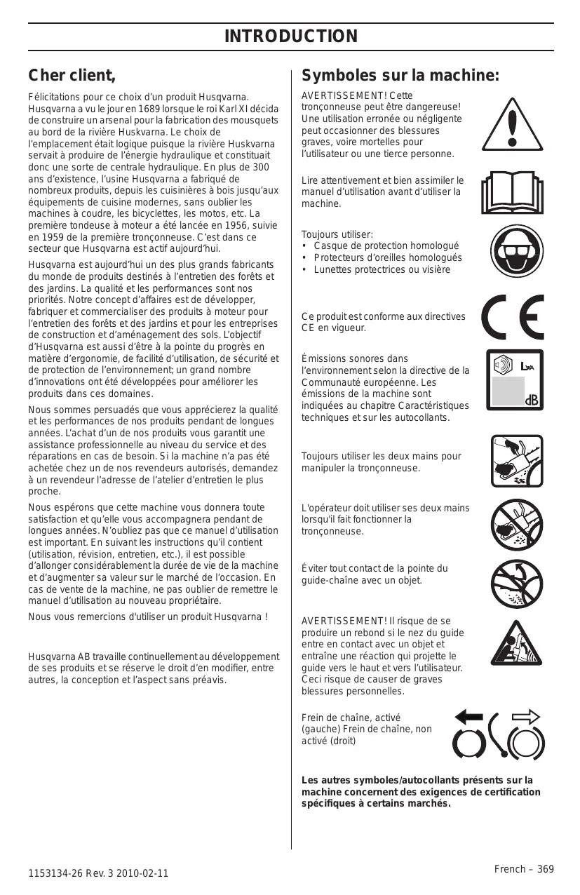 Mesures à prendre avant de mettre en usage une tronçonneuse neuve • Lisez attentivement ce manuel d’utilisation. • (1) - (51) fait référence aux figures des p. 2-5. • Vérifier le montage et le réglage de l’outil de coupe. Voir les instructions au chapitre Montage. • Remplissez de carburant et démarrez la tronçonneuse. Voir les instructions aux chapitres Manipulation du carburant et Démarrage et arrêt. • Ne pas utiliser la tronçonneuse avant que la chaîne ait reçu une quantité suffisante d’huile de chaîne. Voir les instructions au chapitre Lubrification de l’équipement de coupe. • Une exposition prolongée au bruit risque de causer des lésions auditives permanentes. Toujours utiliser des protecteurs d'oreille agréés.