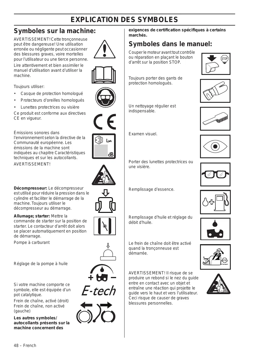 - Lunettes protectrices ou visière Ce produit est conforme aux directives CE en vigueur. Un nettoyage régulier est indispensable. Émissions sonores dans l’environnement selon la directive de la Communauté européenne. Les émissions de la machine sont indiquées au chapitre Caractéristiques techniques et sur les autocollants. AVERTISSEMENT! Examen visuel. Décompresseur: Le décompresseur est utilisé pour réduire la pression dans le cylindre et faciliter le démarrage de la machine. Toujours utiliser le décompresseur au démarrage. Remplissage d’essence. Allumage; starter: Mettre la commande de starter sur la position de starter. Le contacteur d’arrêt doit alors se placer automatiquement en position de démarrage. Pompe à carburant Remplissage d’huile et réglage du débit d’huile. Porter des lunettes protectrices ou une visière. Le frein de chaîne doit être activé quand la tronçonneuse est démarrée. Réglage de la pompe à huile Si votre machine comporte ce symbole, elle est équipée d’un pot catalytique. Frein de chaîne, activé (droit) Frein de chaîne, non activé (gauche) Les autres symboles/ autocollants présents sur la machine concernent des 48 – French AVERTISSEMENT! Il risque de se produire un rebond si le nez du guide entre en contact avec un objet et entraîne une réaction qui projette le guide vers le haut et vers l’utilisateur. Ceci risque de causer de graves blessures personnelles. SOMMAIRE Sommaire