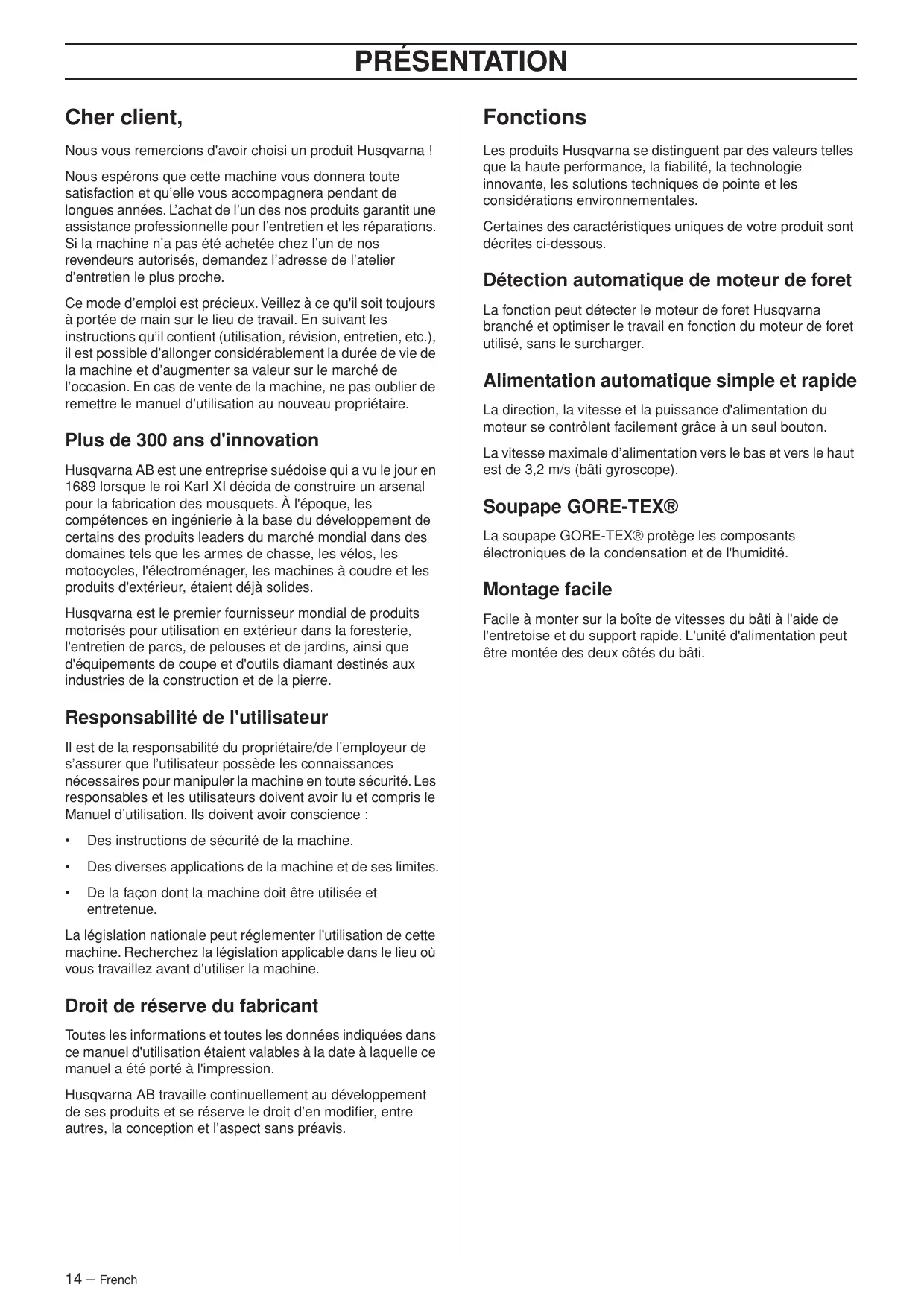 French – 13 PRÉSENTATION Cher client, Fonctions Nous vous remercions d'avoir choisi un produit Husqvarna ! Les produits Husqvarna se distinguent par des valeurs telles que la haute performance, la fiabilité, la technologie innovante, les solutions techniques de pointe et les considérations environnementales. Nous espérons que cette machine vous donnera toute satisfaction et qu’elle vous accompagnera pendant de longues années. L’achat de l’un des nos produits garantit une assistance professionnelle pour l’entretien et les réparations. Si la machine n’a pas été achetée chez l’un de nos revendeurs autorisés, demandez l’adresse de l’atelier d’entretien le plus proche. Ce mode d’emploi est précieux. Veillez à ce qu'il soit toujours à portée de main sur le lieu de travail. En suivant les instructions qu’il contient (utilisation, révision, entretien, etc.), il est possible d’allonger considérablement la durée de vie de la machine et d’augmenter sa valeur sur le marché de l’occasion. En cas de vente de la machine, ne pas oublier de remettre le manuel d’utilisation au nouveau propriétaire. Plus de 300 ans d'innovation Husqvarna AB est une entreprise suédoise qui a vu le jour en 1689 lorsque le roi Karl XI décida de construire un arsenal pour la fabrication des mousquets. À l'époque, les compétences en ingénierie à la base du développement de certains des produits leaders du marché mondial dans des domaines tels que les armes de chasse, les vélos, les motocycles, l'électroménager, les machines à coudre et les produits d'extérieur, étaient déjà solides. Husqvarna est le premier fournisseur mondial de produits motorisés pour utilisation en extérieur dans la foresterie, l'entretien de parcs, de pelouses et de jardins, ainsi que d'équipements de coupe et d'outils diamant destinés aux industries de la construction et de la pierre. Responsabilité de l'utilisateur Il est de la responsabilité du propriétaire/de l’employeur de s’assurer que l’utilisateur possède les connaissances nécessaires pour manipuler la machine en toute sécurité. Les responsables et les utilisateurs doivent avoir lu et compris le Manuel d’utilisation. Ils doivent avoir conscience :