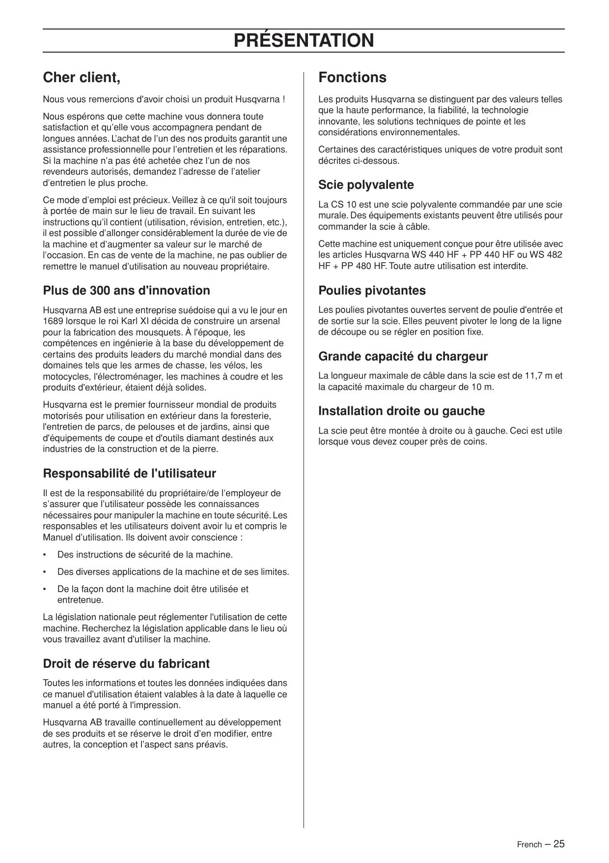 PRÉSENTATION Cher client, Fonctions Nous vous remercions d'avoir choisi un produit Husqvarna ! Les produits Husqvarna se distinguent par des valeurs telles que la haute performance, la fiabilité, la technologie innovante, les solutions techniques de pointe et les considérations environnementales. Nous espérons que cette machine vous donnera toute satisfaction et qu’elle vous accompagnera pendant de longues années. L’achat de l’un des nos produits garantit une assistance professionnelle pour l’entretien et les réparations. Si la machine n’a pas été achetée chez l’un de nos revendeurs autorisés, demandez l’adresse de l’atelier d’entretien le plus proche. Certaines des caractéristiques uniques de votre produit sont décrites ci-dessous. Scie polyvalente Ce mode d’emploi est précieux. Veillez à ce qu'il soit toujours à portée de main sur le lieu de travail. En suivant les instructions qu’il contient (utilisation, révision, entretien, etc.), il est possible d’allonger considérablement la durée de vie de la machine et d’augmenter sa valeur sur le marché de l’occasion. En cas de vente de la machine, ne pas oublier de remettre le manuel d’utilisation au nouveau propriétaire. La CS 10 est une scie polyvalente commandée par une scie murale. Des équipements existants peuvent être utilisés pour commander la scie à câble. Plus de 300 ans d'innovation Poulies pivotantes Husqvarna AB est une entreprise suédoise qui a vu le jour en 1689 lorsque le roi Karl XI décida de construire un arsenal pour la fabrication des mousquets. À l'époque, les compétences en ingénierie à la base du développement de certains des produits leaders du marché mondial dans des domaines tels que les armes de chasse, les vélos, les motocycles, l'électroménager, les machines à coudre et les produits d'extérieur, étaient déjà solides. Les poulies pivotantes ouvertes servent de poulie d'entrée et de sortie sur la scie. Elles peuvent pivoter le long de la ligne de découpe ou se régler en position fixe. Husqvarna est le premier fournisseur mondial de produits motorisés pour utilisation en extérieur dans la foresterie, l'entretien de parcs, de pelouses et de jardins, ainsi que d'équipements de coupe et d'outils diamant destinés aux industries de la construction et de la pierre. Cette machine est uniquement conçue pour être utilisée avec les articles Husqvarna WS 440 HF + PP 440 HF ou WS 482 HF + PP 480 HF. Toute autre utilisation est interdite. Grande capacité du chargeur La longueur maximale de câble dans la scie est de 11,7 m et la capacité maximale du chargeur de 10 m. Installation droite ou gauche La scie peut être montée à droite ou à gauche. Ceci est utile lorsque vous devez couper près de coins. Responsabilité de l'utilisateur Il est de la responsabilité du propriétaire/de l’employeur de s’assurer que l’utilisateur possède les connaissances nécessaires pour manipuler la machine en toute sécurité. Les responsables et les utilisateurs doivent avoir lu et compris le Manuel d’utilisation. Ils doivent avoir conscience :