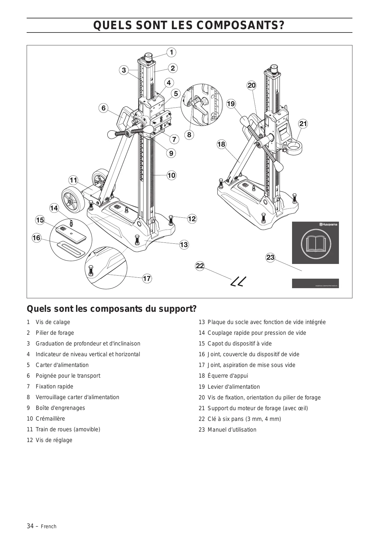 QUELS SONT LES COMPOSANTS? bHusqpema Quels sont les composants du support? Vis de calage Pilier de forage Graduation de profondeur et d'inclinaison Indicateur de niveau vertical et horizontal Carter d'alimentation Poignée pour le transport Fixation rapide Verrouillage carter d'alimentation © ® où PR Ww ND # Boîte d'engrenages 10 Crémaillère 11 Train de roues (amovible) 12 Vis de réglage