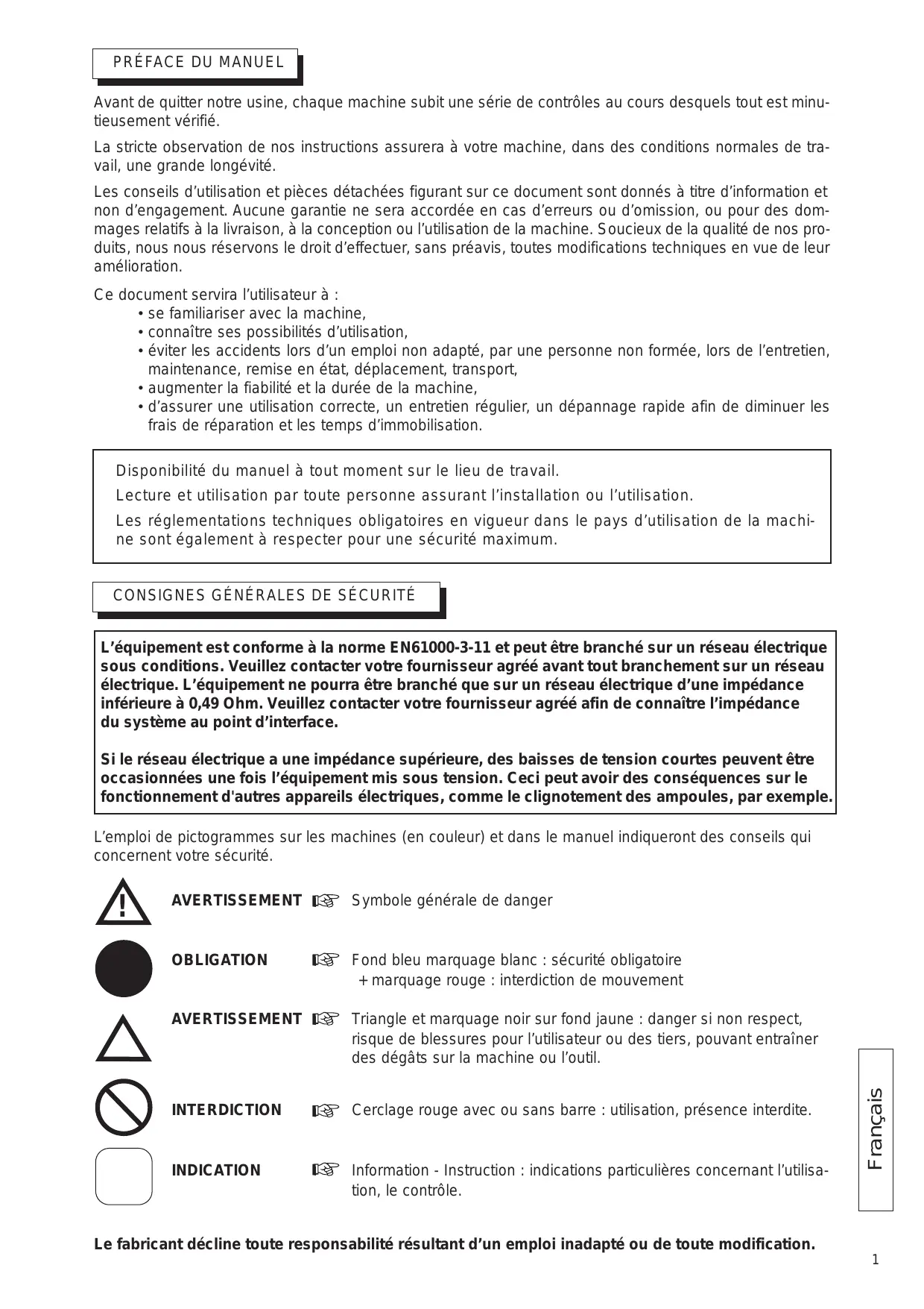 PRÉFACE DU MANUEL Avant de quitter notre usine, chaque machine subit une série de contrôles au cours desquels tout est minutieusement vérifié.