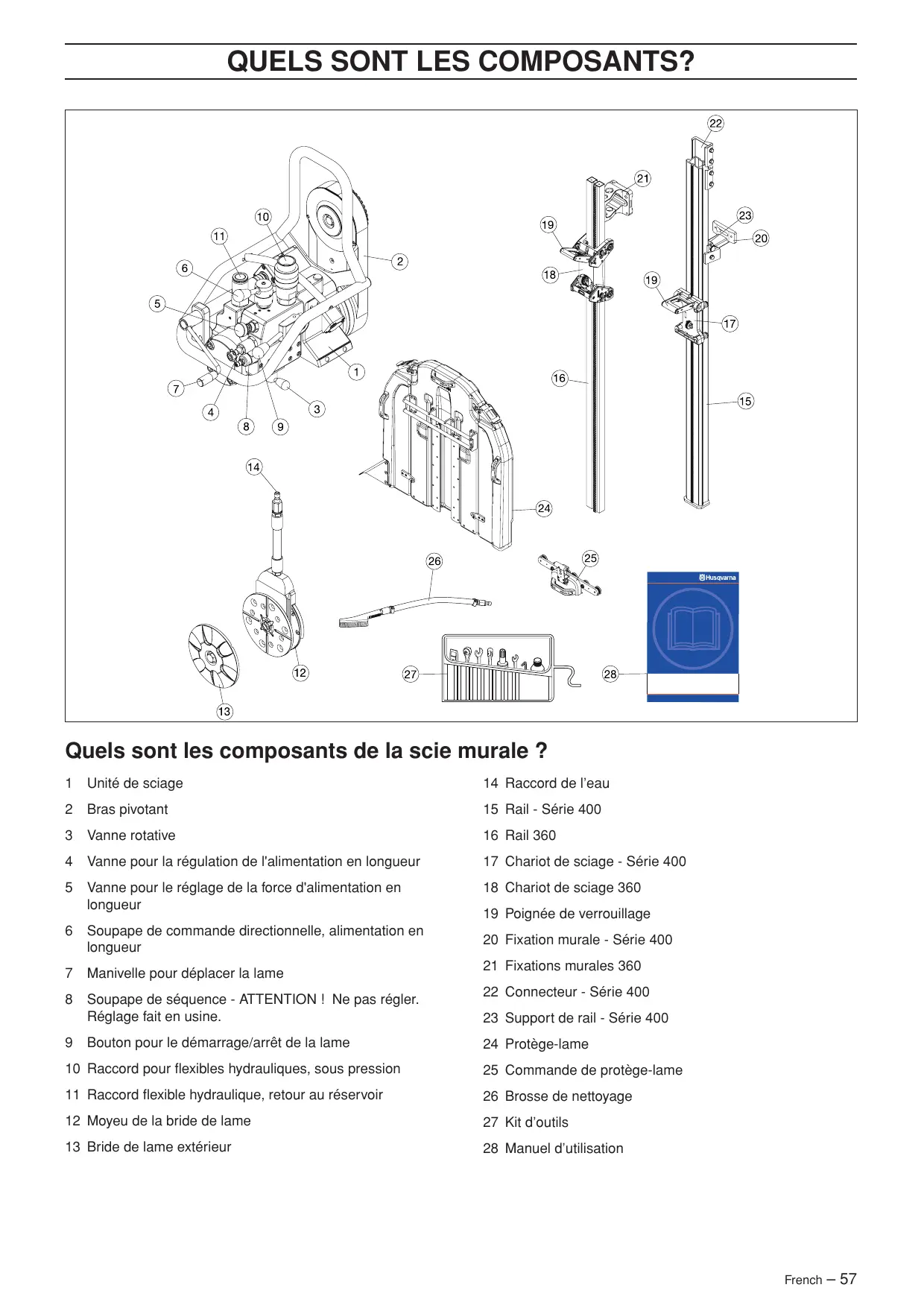 Bouton pour le démarrage/arrêt de la lame 19 Poignée de verrouillage 20 Fixation murale - Série 400 21 Fixations murales 360 22 Connecteur - Série 400 23 Support de rail - Série 400 24 Protège-lame 10 Raccord pour flexibles hydrauliques, sous pression 25 Commande de protège-lame 11 Raccord flexible hydraulique, retour au réservoir 26 Brosse de nettoyage 12 Moyeu de la bride de lame 27 Kit d’outils 13 Bride de lame extérieur 28 Manuel d’utilisation French – 57
