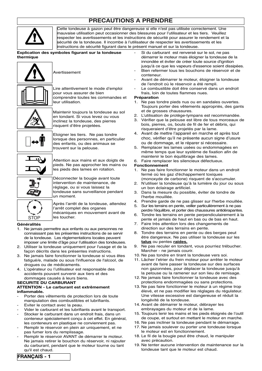 5. Remplacer les lames usées ou endommagées en même temps que leur système de fixation afin de maintenir le bon équilibrage des lames. 6. Faire remplacer les silencieux défectueux. Fonctionnement 1. Ne pas faire fonctionner le moteur dans un endroit fermé où les gaz d'échappement toxiques (monoxyde de carbone) risquent de s'accumuler. 2. N’utiliser la tondeuse qu’à la lumière du jour ou sous un bon éclairage artificiel. 3. Dans la mesure du possible, éviter de tondre de l'herbe mouillée. 4. Prendre garde de ne pas glisser sur l'herbe mouillée. 5. Sur les terrains en pente, veiller particulièrement à ne pas perdre l’équilibre, et porter des chaussures antidérapantes. 6. Tondre les terrains en pente perpendiculairement à la pente et jamais de haut en bas ou de bas en haut. 7. Faire très attention lors des changements de direction sur des terrains en pente. 8. Tondre des terrains en pente ou des berges peut être dangereux. Ne pas utiliser la tondeuse sur les talus ou pentes raides. 9. Ne pas reculer en tondant, vous pourriez trébucher. Marcher - ne jamais courir. 10. Ne pas tondre en tirant la tondeuse vers soi. 11. Lâcher l’etrier du frein moteur pour arrêter le moteur avant de faire passer la tondeuse sur des surfaces non gazonnées, pour déplacer la tondeuse jusqu'à la pelouse ou la ramener sur son lieu de remisage. 12. Ne jamais faire fonctionner la tondeuse avec des protections endommagées ou sans protections. 13. Ne pas faire fonctionner le moteur à un régime trop élevé, et ne pas modifier les réglages du régulateur. Une vitesse excessive est dangereuse et réduit la longévité de la tondeuse. 14. Avant de démarrer le moteur, débrayer les embrayages du moteur et de la lame. 15. Toujours tenir les mains et les pieds éloignés de l’outil de coupe, et surtout en mettant le moteur en marche. 16. Ne pas incliner la tondeuse pendant le démarrage. 17. Ne jamais soulever ou porter une tondeuse lorsque le moteur est en fonctionnement. 18. Le fil de la bougie peut être chaud, le manipuler avec précaution. 19. Ne tenter aucune intervention de maintenance sur la tondeuse tant que le moteur est chaud.