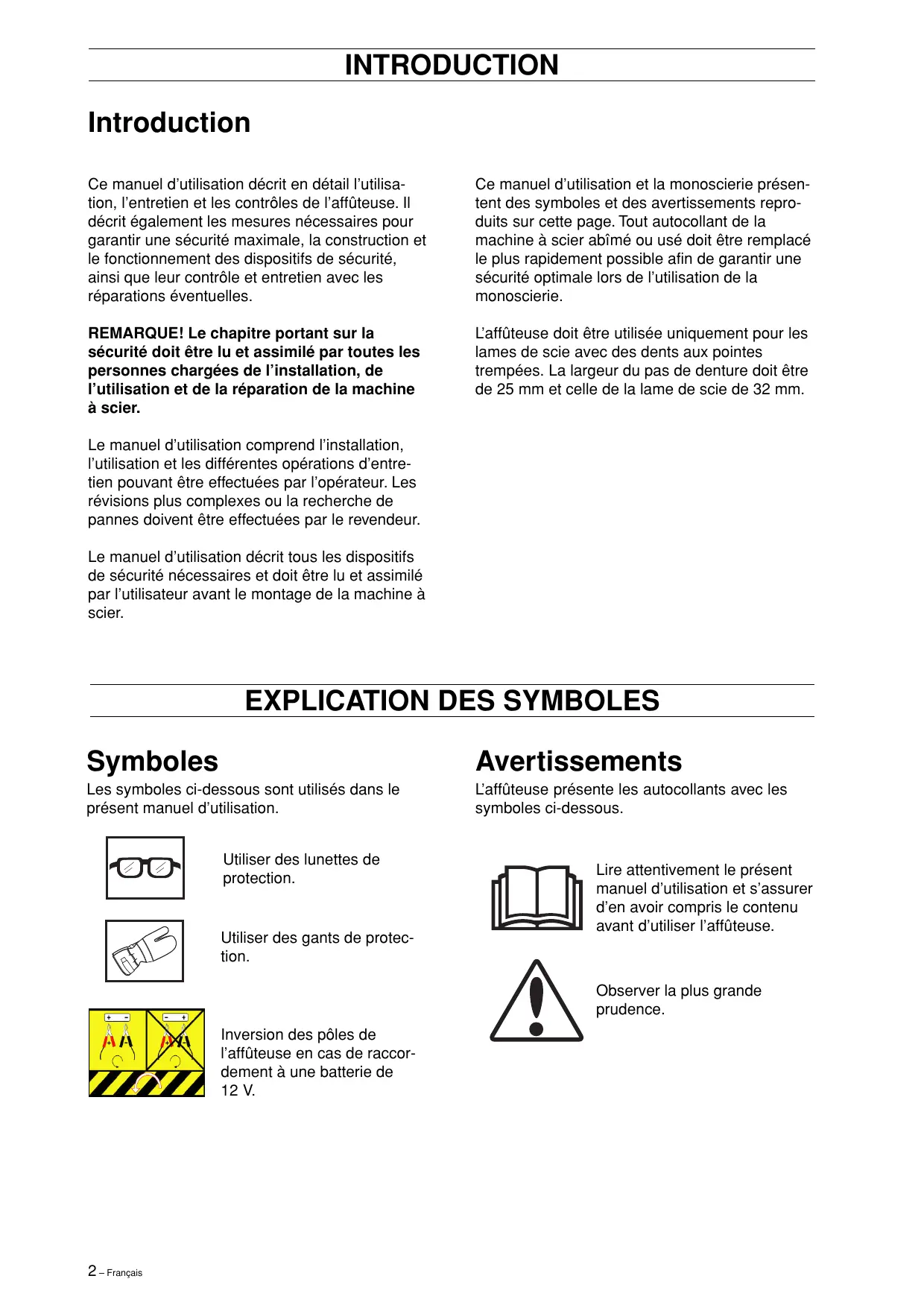 Ce manuel d'utilisation et la machine à scier présentent des symboles et des avertissements reproduits sur cette page. Tout autocollant de la machine à scier abîmé ou usé doit être remplacé le plus rapidement possible afin de garantir une sécurité optimale lors de son utilisation.