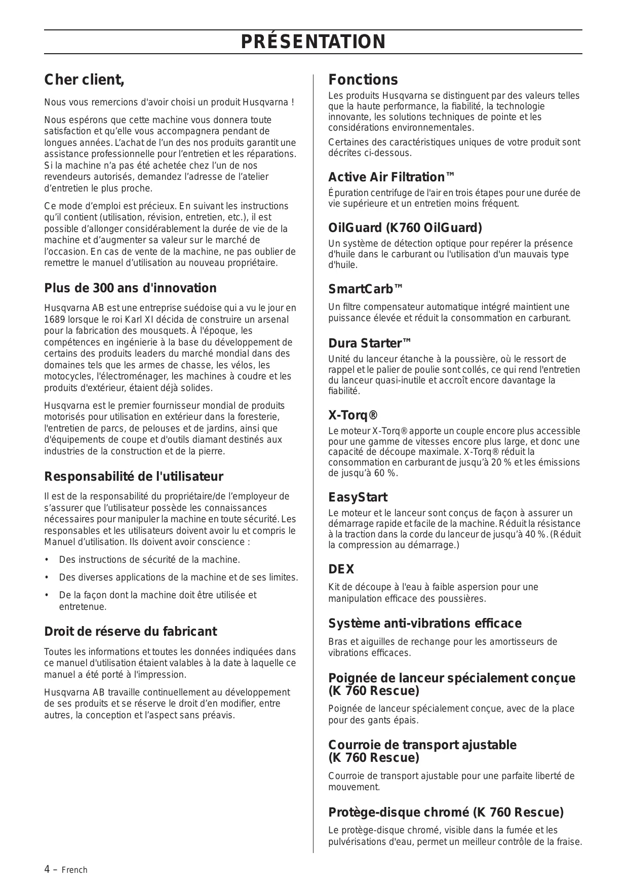 PRÉSENTATION Cher client, Nous vous remercions d'avoir choisi un produit Husqvarna ! Nous espérons que cette machine vous donnera toute satisfaction et qu’elle vous accompagnera pendant de longues années. L’achat de l’un des nos produits garantit une assistance professionnelle pour l’entretien et les réparations. Si la machine n’a pas été achetée chez l’un de nos revendeurs autorisés, demandez l’adresse de l’atelier d’entretien le plus proche. Ce mode d’emploi est précieux. En suivant les instructions qu’il contient (utilisation, révision, entretien, etc.), il est possible d’allonger considérablement la durée de vie de la machine et d’augmenter sa valeur sur le marché de l’occasion. En cas de vente de la machine, ne pas oublier de remettre le manuel d’utilisation au nouveau propriétaire. Fonctions Les produits Husqvarna se distinguent par des valeurs telles que la haute performance, la fiabilité, la technologie innovante, les solutions techniques de pointe et les considérations environnementales. Certaines des caractéristiques uniques de votre produit sont décrites ci-dessous. Active Air Filtration™ Épuration centrifuge de l'air en trois étapes pour une durée de vie supérieure et un entretien moins fréquent. OilGuard (K760 OilGuard) Un système de détection optique pour repérer la présence d'huile dans le carburant ou l'utilisation d'un mauvais type d'huile. Plus de 300 ans d'innovation SmartCarb™ Husqvarna AB est une entreprise suédoise qui a vu le jour en 1689 lorsque le roi Karl XI décida de construire un arsenal pour la fabrication des mousquets. À l'époque, les compétences en ingénierie à la base du développement de certains des produits leaders du marché mondial dans des domaines tels que les armes de chasse, les vélos, les motocycles, l'électroménager, les machines à coudre et les produits d'extérieur, étaient déjà solides. Un filtre compensateur automatique intégré maintient une puissance élevée et réduit la consommation en carburant. Husqvarna est le premier fournisseur mondial de produits motorisés pour utilisation en extérieur dans la foresterie, l'entretien de parcs, de pelouses et de jardins, ainsi que d'équipements de coupe et d'outils diamant destinés aux industries de la construction et de la pierre. Responsabilité de l'utilisateur Il est de la responsabilité du propriétaire/de l’employeur de s’assurer que l’utilisateur possède les connaissances nécessaires pour manipuler la machine en toute sécurité. Les responsables et les utilisateurs doivent avoir lu et compris le Manuel d’utilisation. Ils doivent avoir conscience :