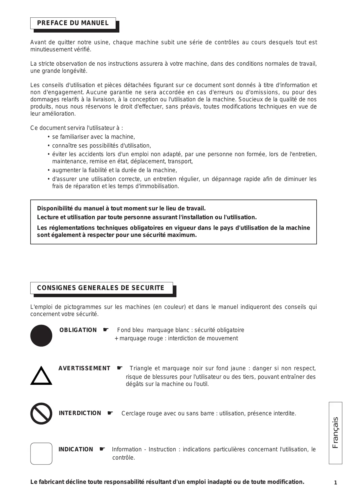 L'emploi de pictogrammes sur les machines (en couleur) et dans le manuel indiqueront des conseils qui concernent votre sécurité. OBLIGATION # Fond bleu marquage blanc : sécurité obligatoire + marquage rouge : interdiction de mouvement AVERTISSEMENT # Triangle et marquage noir sur fond jaune : danger si non respect, risque de blessures pour l'utilisateur ou des tiers, pouvant entraîner des dégâts sur la machine ou l'outil. INTERDICTION # Cerclage rouge avec ou sans barre : utilisation, présence interdite. INDICATION # Information - Instruction : indications particulières concernant l'utilisation, le contrôle.