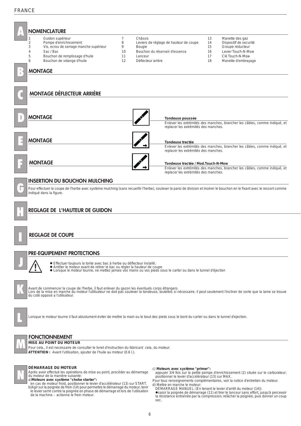 instructions. Dès que le moteur est en marche, il faut absolument empêcher à qui que ce soit de s'approcher avec les mains ou les pieds sous le bord du carter ou dans l'orifice d'échappement. miLors du démarrage du moteur, l'opérateur ne doitjamais soulever la tondeuse; au besoin, l'incliner légèrement de manière à ce que la lame soit orientée vers le côté opposé par rapport à l'opérateur. n)Si la lame heurte contre un obstacle, couper le moteur etenlever le cache de la bougie; s'adresser à un expert pour effectuer un contrôle. Entretien et stockage a)Veiller à ce que les écrous, les boulons etles vis soient parfaitement serrés, pour travailler en toute sécurité. b)Si le réservoir contient encore du carburant, ne jamais laisser la machine dans des lieux où les vapeurs d'essence pourraient atteindre des flammes ou des scintilles cAttendre le refroidissement du moteur avant de placer la machine dans un espace restreint. d)Pour réduire les risques d'incendie, éliminer toute trace d'herbe, de feuilles ou de lubrifiant dans le moteur, le pot d'échappement, le compartiment de la batterie etle réservoir de carburant e)Contrôler souvent le bac à herbe pour vérifier l'absence de tout signe d'usure ou de détérioration. #Pour des raisons de sécurité, remplacer sans attendre les composants usés ou endommagés. 9)En cas de vidange du réservoir avant l'hiver, effectuer cette opération en plein air. hMonter les lames en suivant les instructions; n'utiiser que des lames portant le numéro de série ainsi que le nom ou la marque du Constructeur ou du Fournisseur. iPour protéger les mains lors des opérations de dépo- selrepose des lames, porter des gants spécialement prévus à cet effet. j) Décharger le dispositif Touch-N-Mow et enlever la clé de sécurité avant d'effectuer n'importe quelle opération de nettoyage ou entretien. KIVérifier que le dispositif Touch-N-Mow soit déchargé et la clé en position de bloc avantde procéder au transport de la machine.