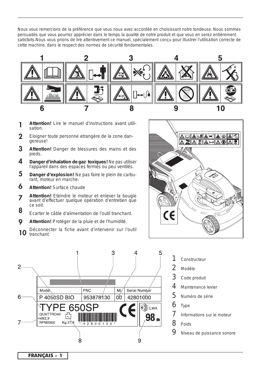 Constructeur Modèle Code produit Maintenance levier Numéro de série Type Informations sur le moteur Poids Niveau de puissance sonore